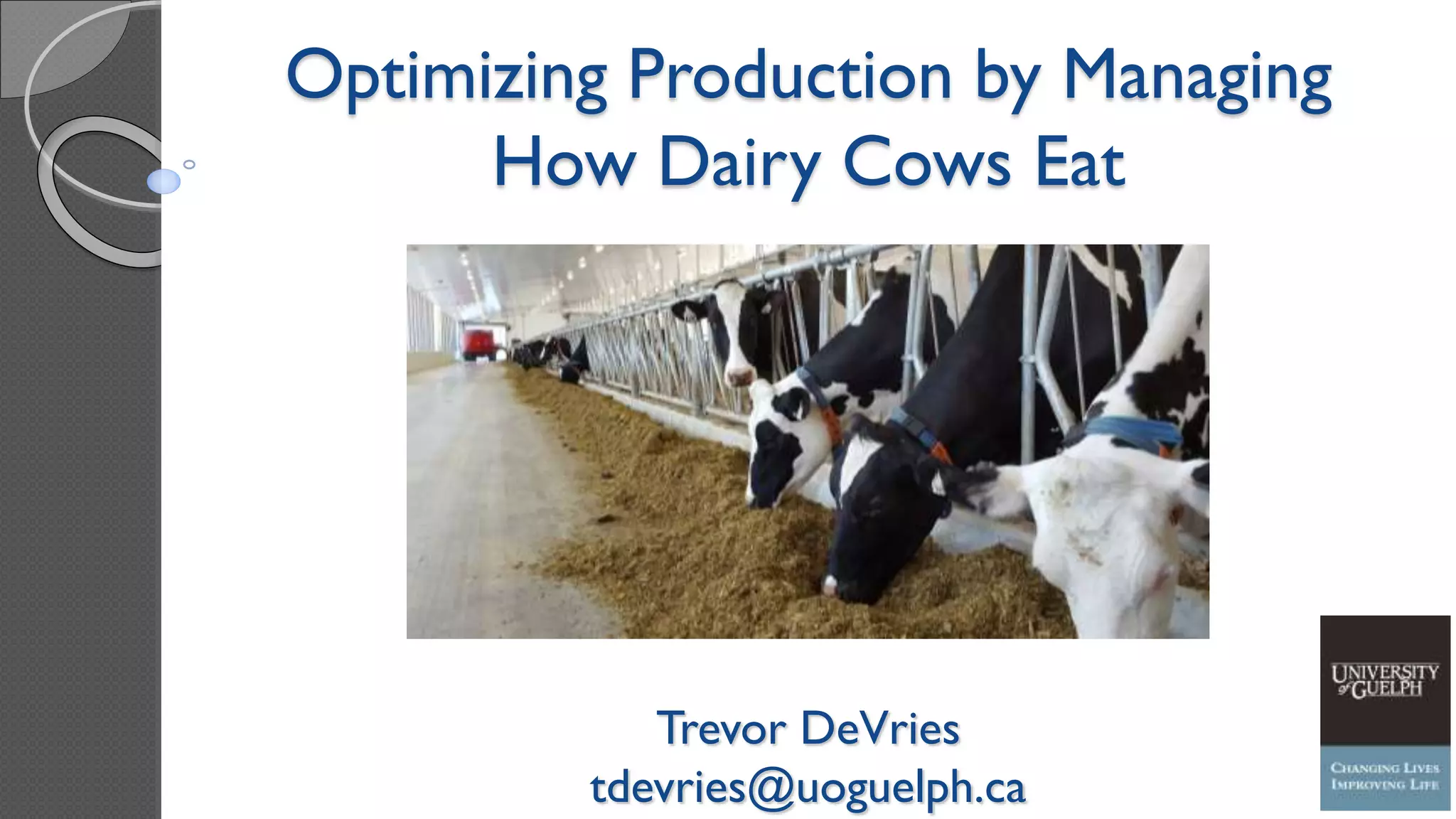 The document discusses optimizing dairy cattle's production through effective feeding management, emphasizing the importance of dietary formulation and feed access. It highlights that increased meal frequency and better feed availability lead to higher dry matter intake and improved milk yield and composition. The document also suggests innovative feeding strategies, including automation, to ensure cows eat when they need and reduces competition for feed.