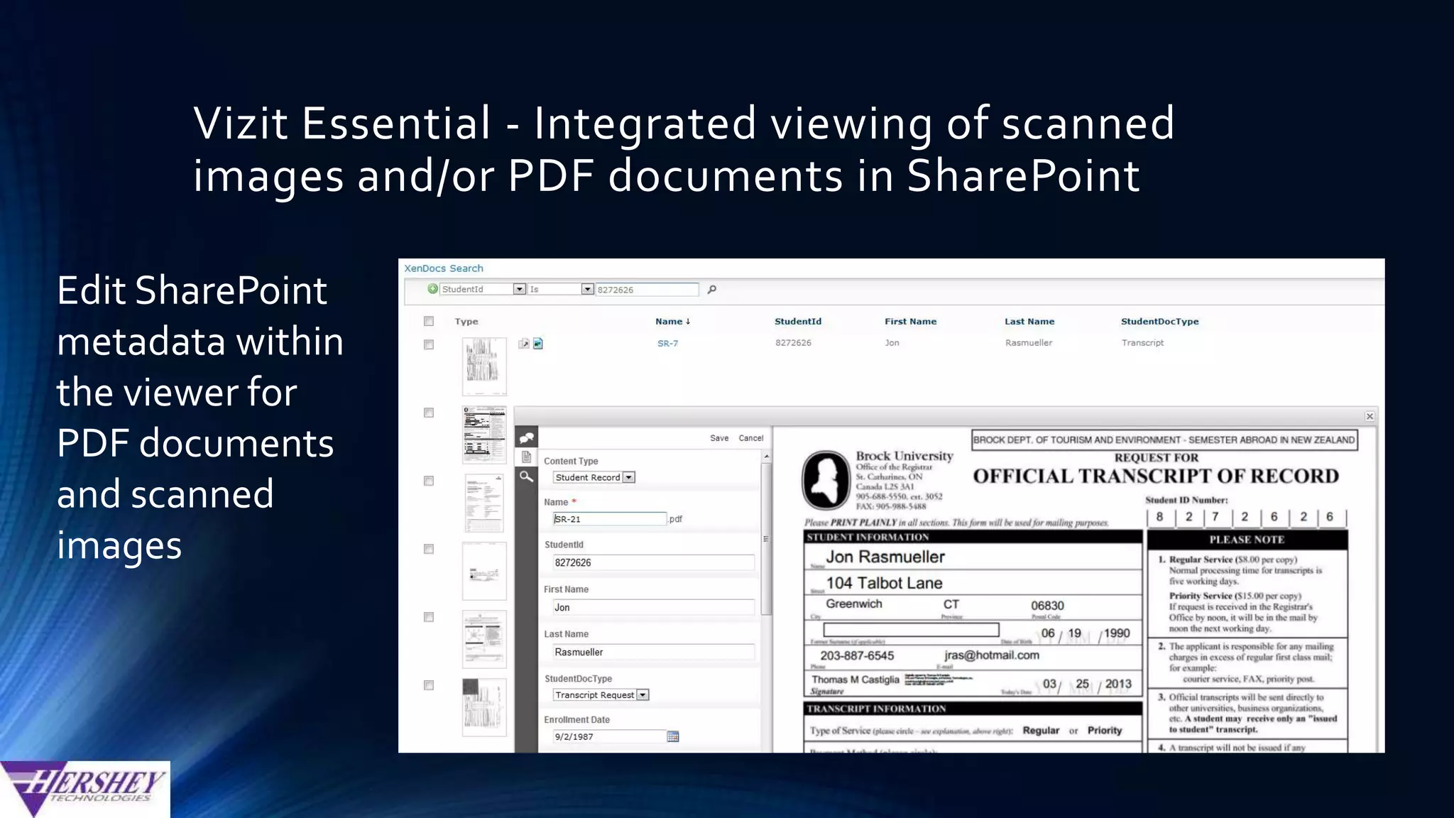 The document details Hershey Technologies' approach to optimizing SharePoint for transactional content management (TCM), highlighting challenges and potential solutions. Key topics include the importance of metadata in search functionality, the limitations of SharePoint's native services, and the benefits of third-party solutions like Vizit for improved document handling. The presentation emphasizes the need for extensive planning and configuration to effectively utilize SharePoint for managing high-volume, static transactional documents.
