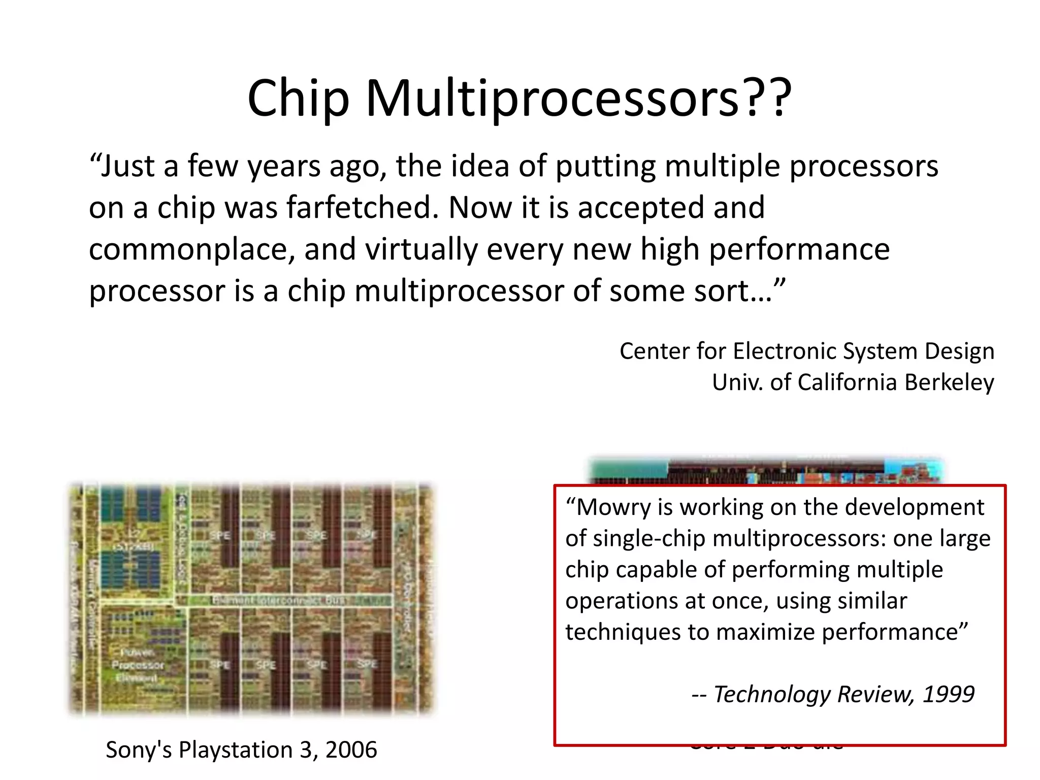 Chip multiprocessors, which place multiple processors on a single chip, have become common in modern processors. There are different approaches to managing caches in chip multiprocessors, including private caches for each processor or shared caches. The optimal approach balances factors like interconnect traffic, duplication of data, load balancing, and cache hit rates.