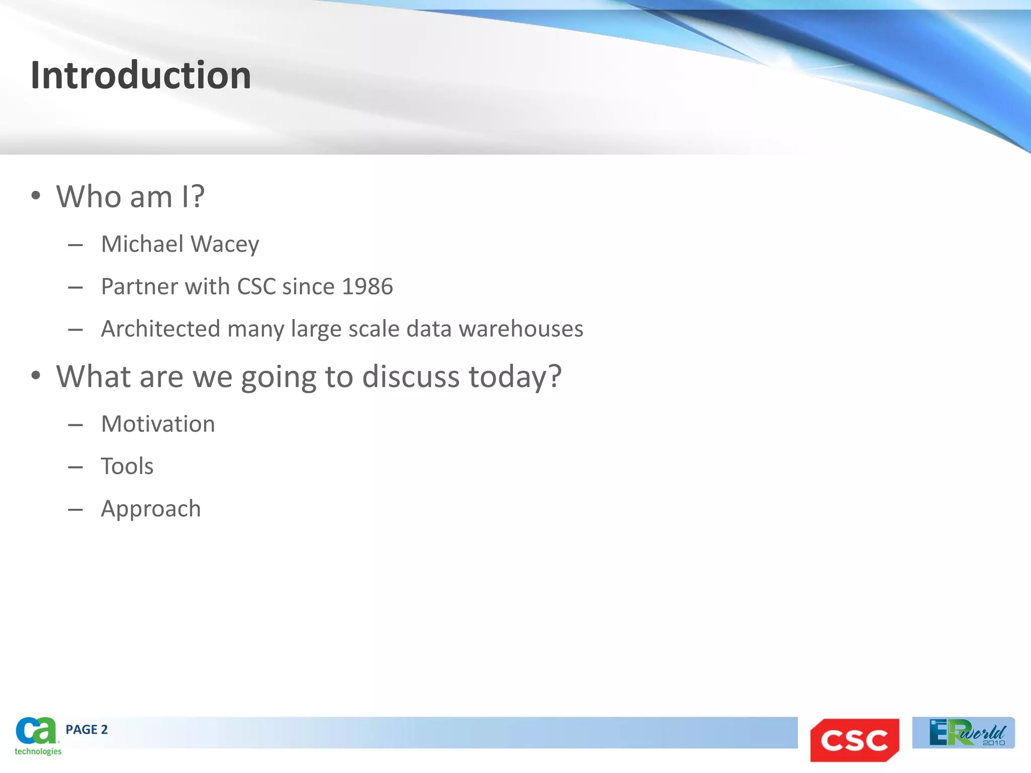 This document discusses optimizing the design of a data warehouse using ERwin Data Modeler (ERwin DM) and ERwin Process Modeler (ERwin PM). It recommends using ERwin PM to model the data flow through context and level 1 diagrams, then using ERwin DM to further model external entities, data stores, and activities identified in the diagrams. Subject areas in ERwin DM are named based on the activity/entity they represent. Together, the two tools provide technical and business users a comprehensive understanding of how data will flow and be stored in the data warehouse.