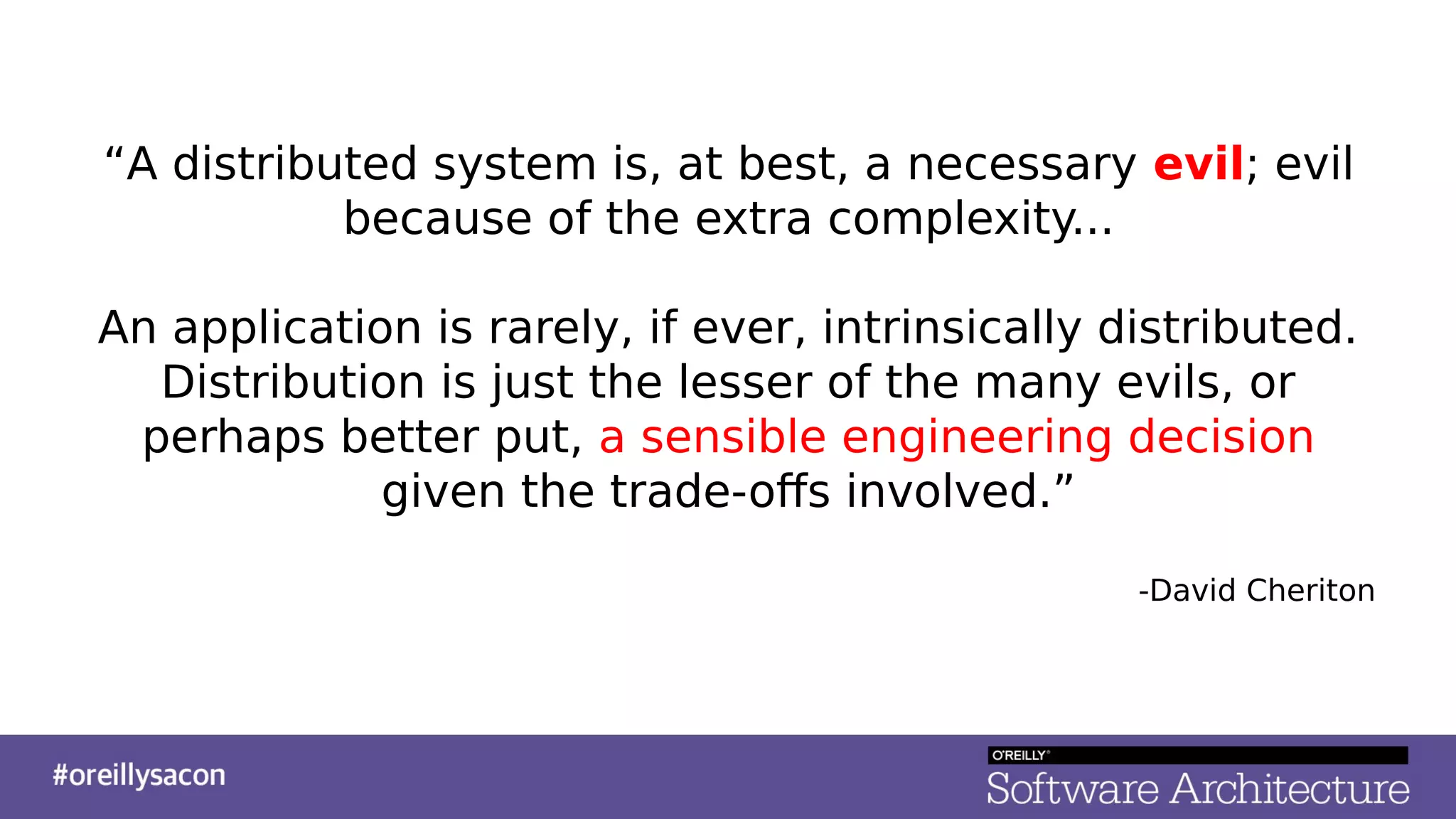 The document discusses the complexities and challenges of distributed systems, highlighting the importance of managing uptime and the trade-offs involved in service-oriented architecture (SOA). It emphasizes strategies for optimizing uptime, such as the use of timeouts, retries, caching, and the need for idempotence to ensure robust operations. It also outlines the implications of network failures and strategies for effective caching and degraded modes to enhance system availability.