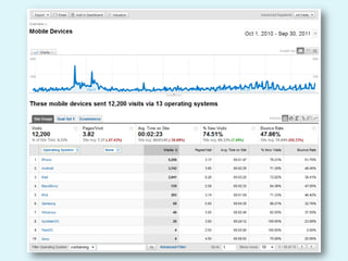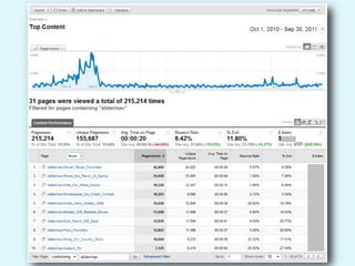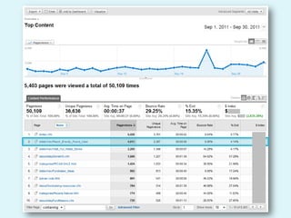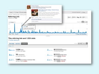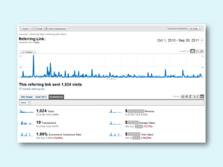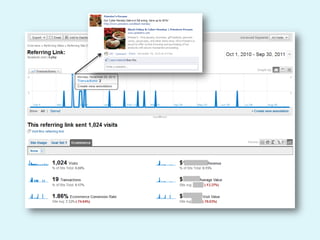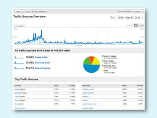The document discusses web analytics and how it can be used to understand user behavior on a website, optimize the user experience, track the effectiveness of marketing efforts, and increase conversions and returns on investment. It provides definitions and examples of key metrics that can be measured through analytics tools like Google Analytics, and gives a case study showing how one company used analytics to improve seasonal online sales.