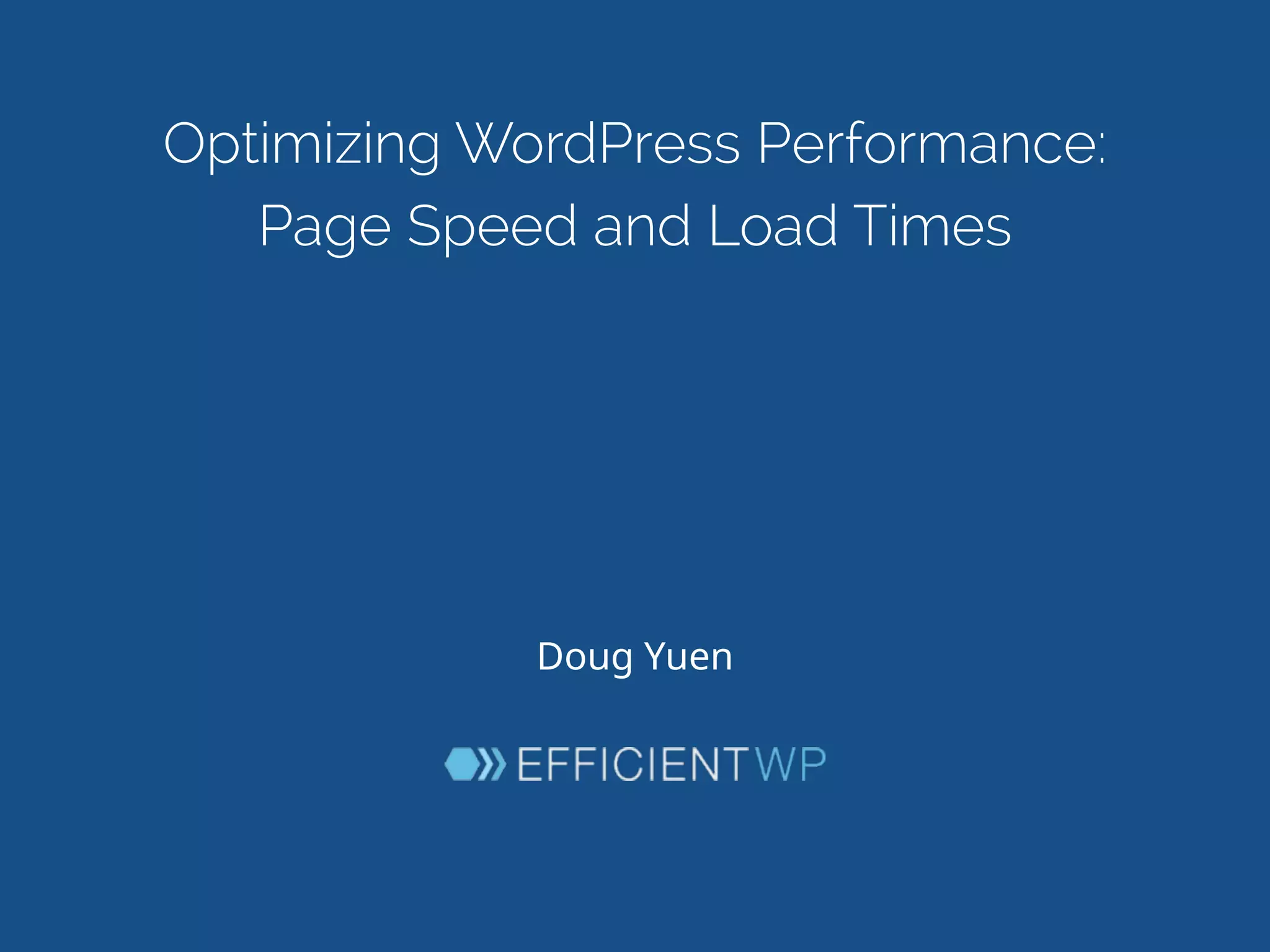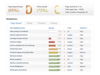 The document discusses optimizing WordPress performance with a focus on page speed and load times. Key strategies include monitoring site uptime, utilizing performance measurement tools, and implementing optimizations such as image compression, caching, and managing plugins. The importance of page speed is highlighted, linking it to user retention and conversion rates, which can significantly impact revenue for e-commerce sites.