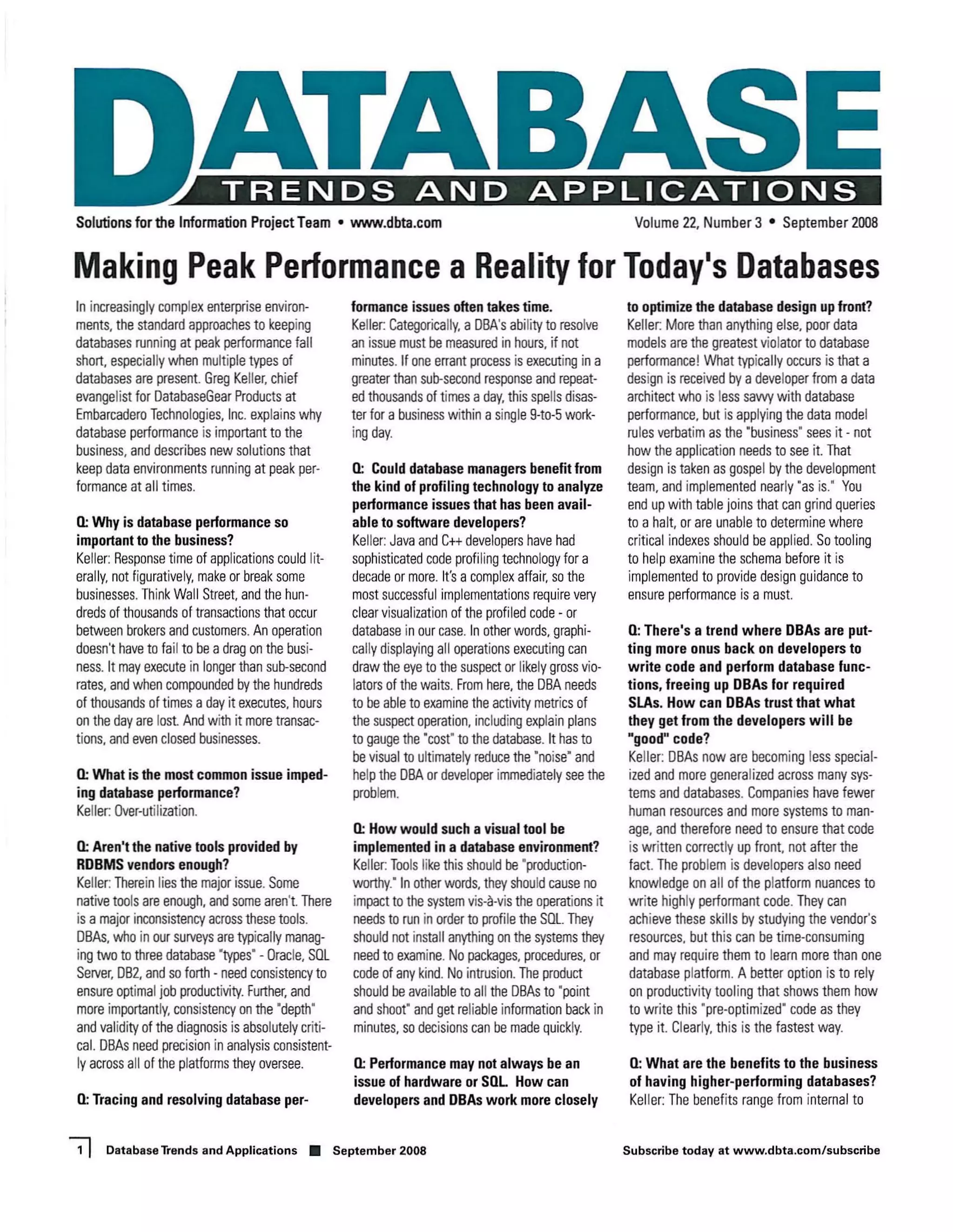 The document discusses the importance of database performance for businesses and introduces new solutions to optimize database environments. It emphasizes the need for effective collaboration between developers and database administrators to prevent performance issues, which can cost businesses time and transactions. Additionally, it highlights the benefits of using advanced profiling tools to enhance efficiency and ensure that applications run smoothly.