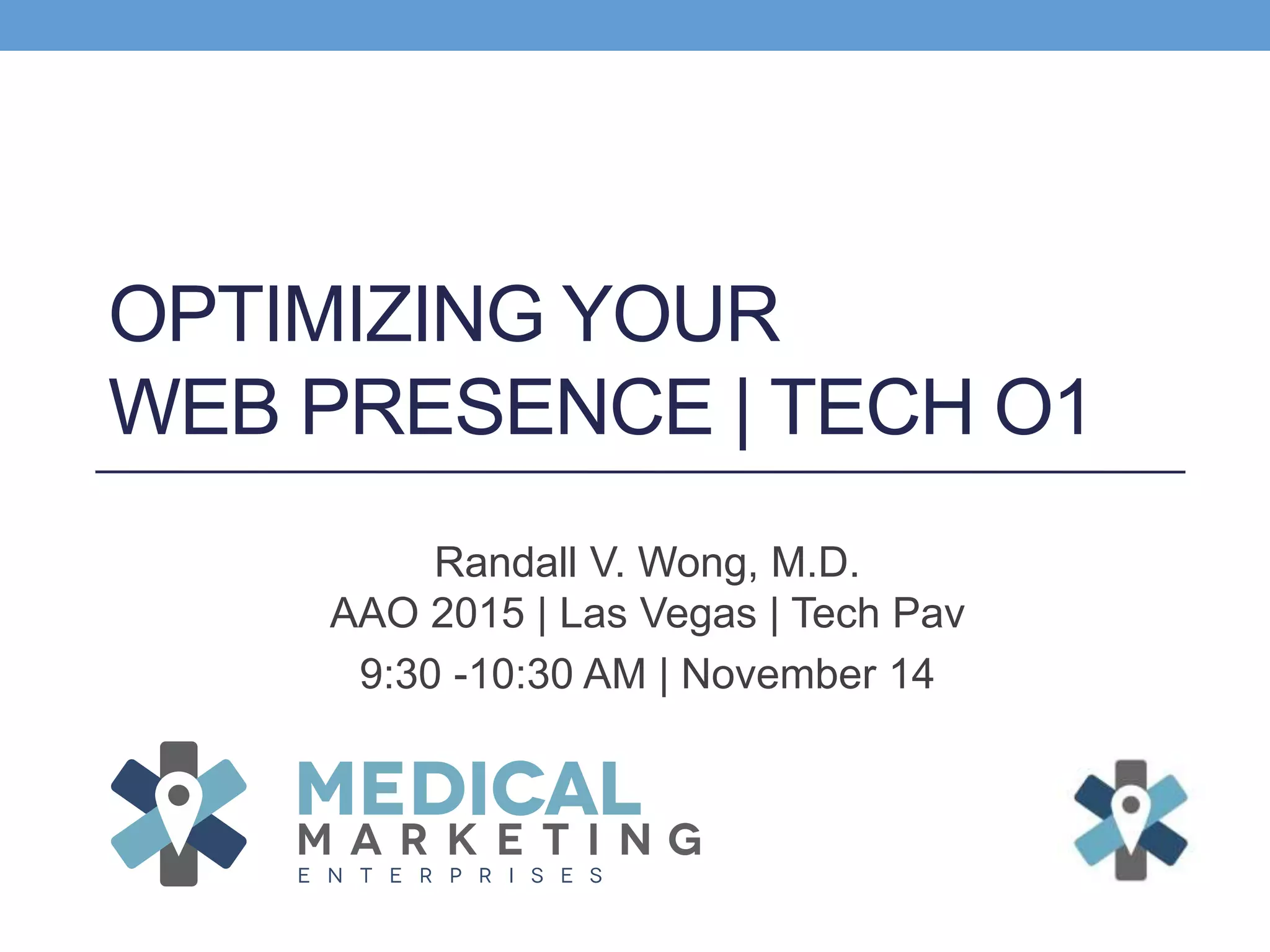 Randall Wong will be giving several presentations at the AAO 2015 conference in Las Vegas on optimizing online presence and reputation management. His first presentation is titled "Optimizing Your Office Web Presence" and will discuss search engine optimization (SEO), content marketing, links, and making websites mobile responsive to increase search engine rankings. SEO involves optimizing website content, title tags, and other on-page and off-page factors to help search engines understand and rank pages higher. Optimizing content through relevant, refreshed articles is fundamental to SEO and marketing online.