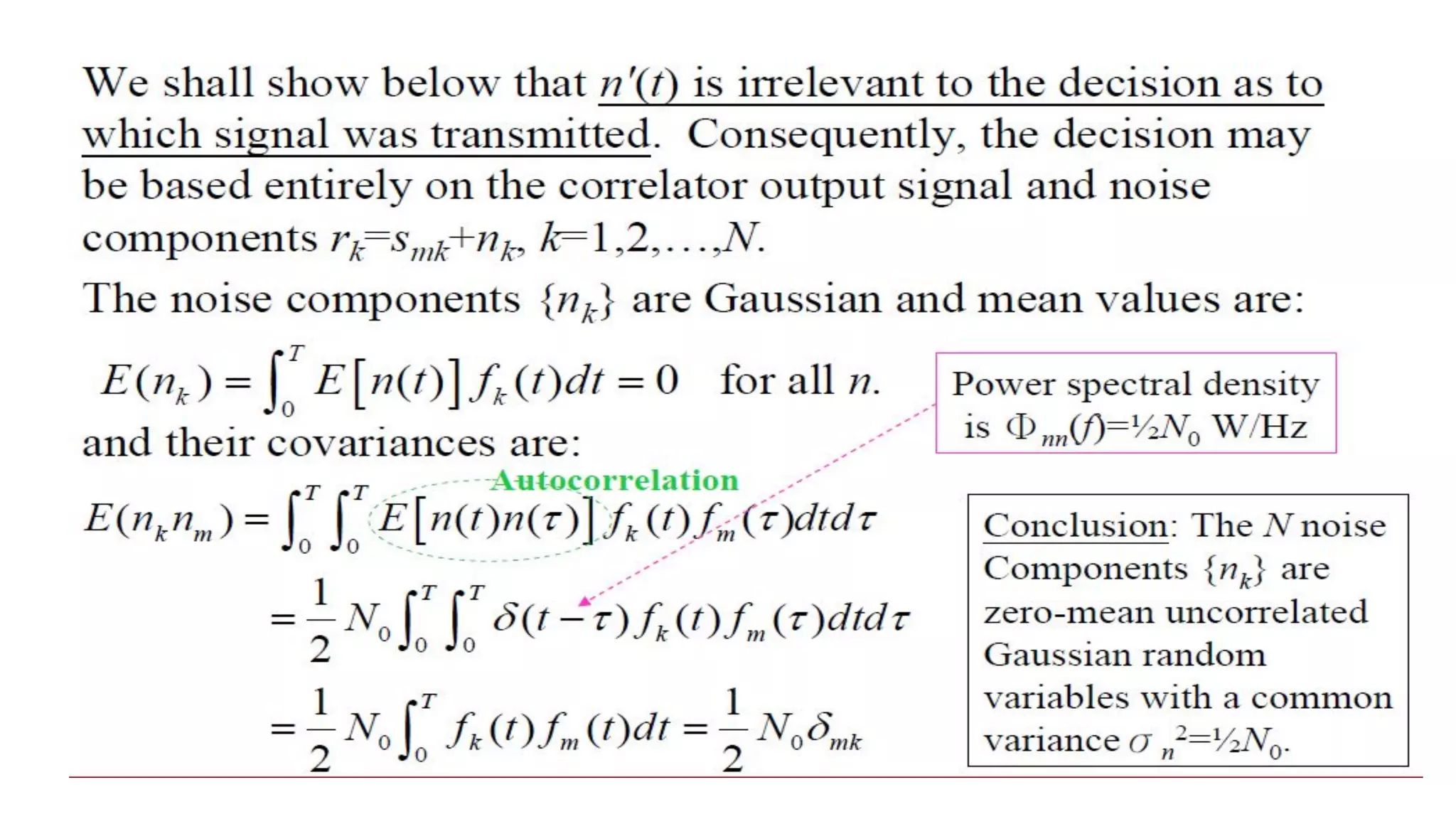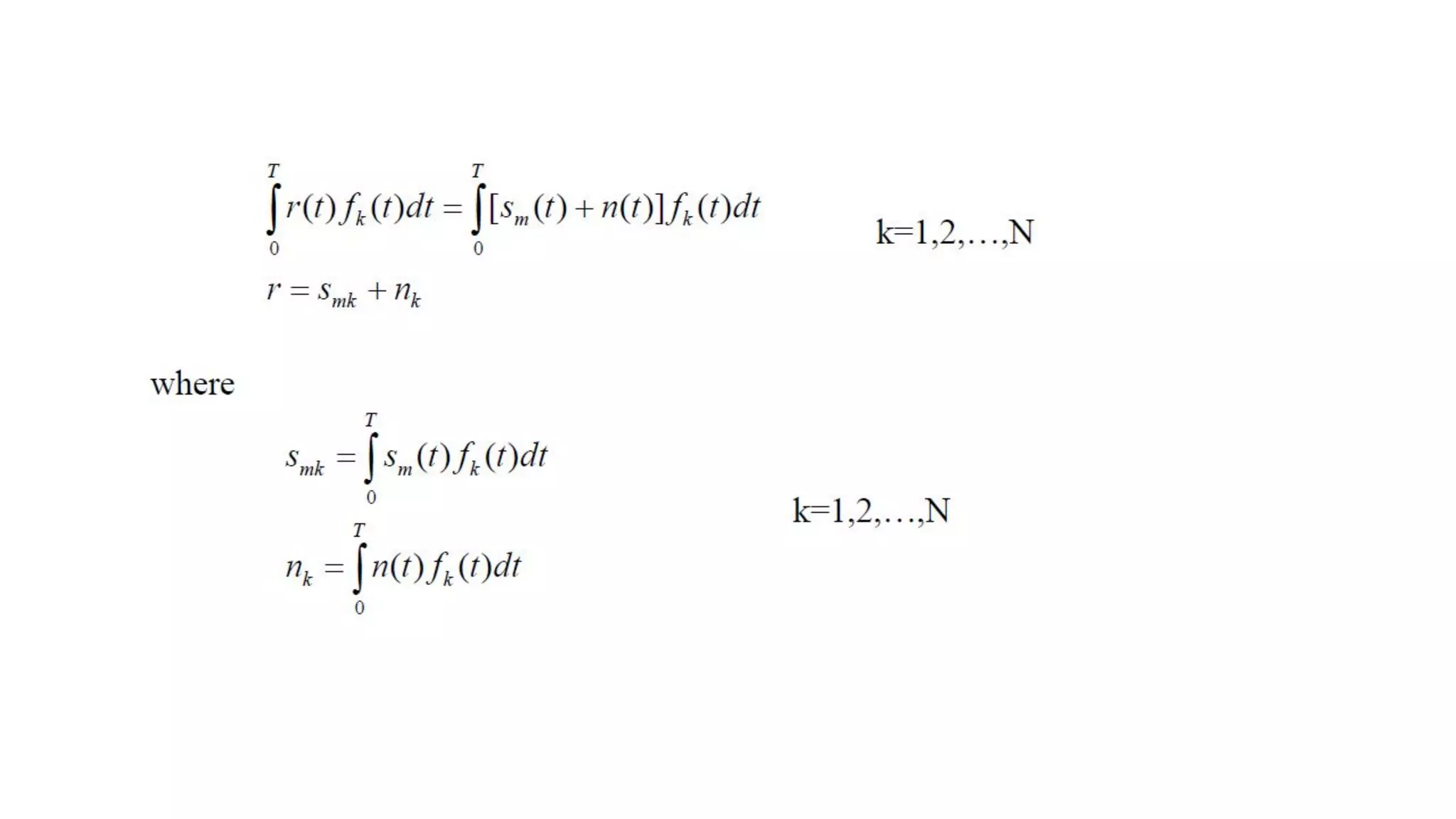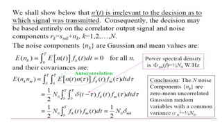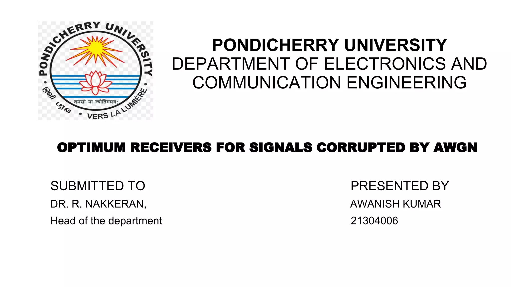 The document discusses the design of optimum receivers for signals corrupted by additive white Gaussian noise (AWGN) within the field of electronics and communication engineering. It outlines methods such as correlation and matched-filter demodulators, focuses on minimizing error probability, and presents decision criteria for signal detection. Key concepts include signal representation, the role of noise in detection, and the utilization of distance and correlation metrics in determining the transmitted signal.