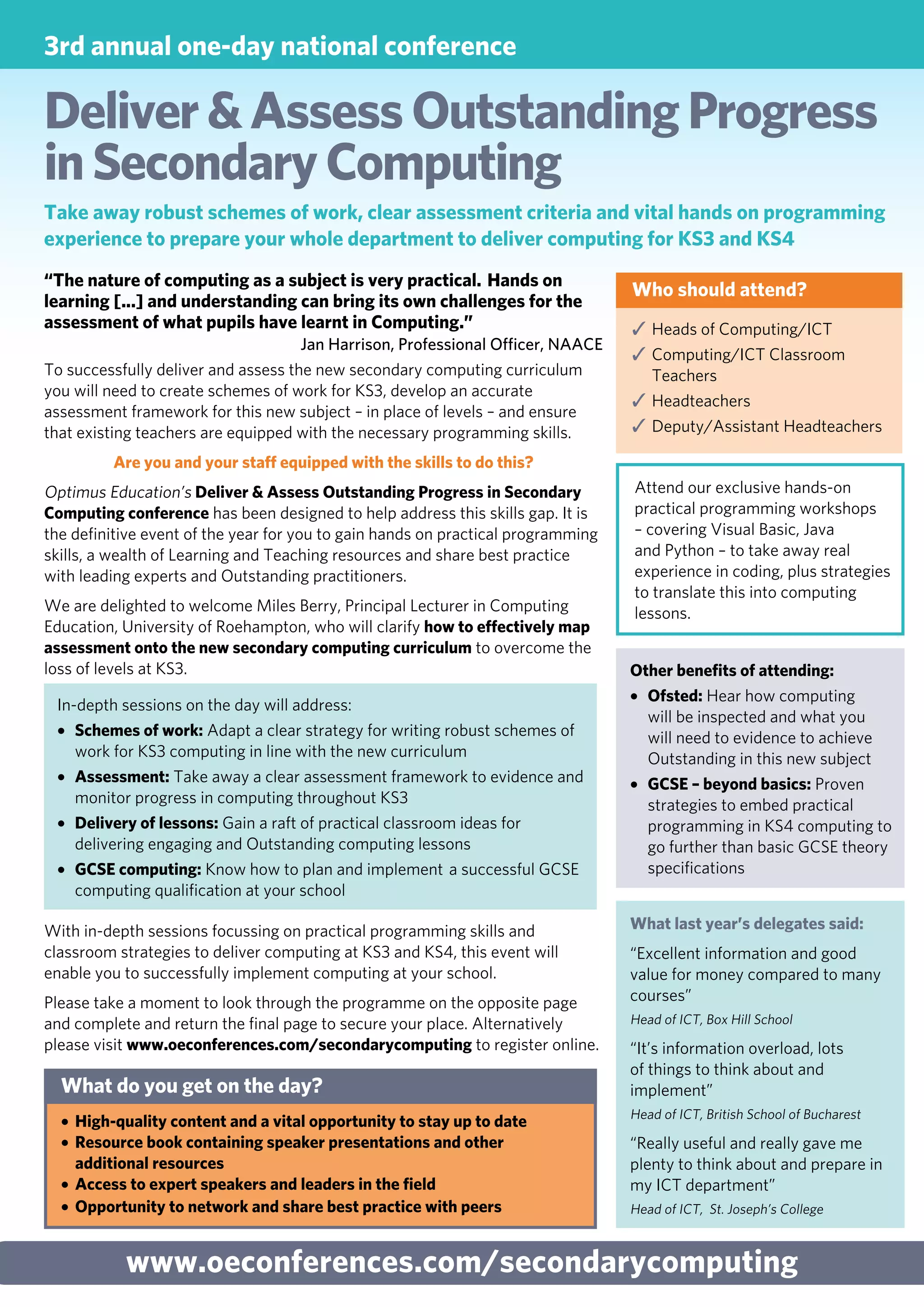 This document advertises and provides information about the "Deliver & Assess Outstanding Progress in Secondary Computing" conference. The one-day conference will provide attendees with practical programming skills, robust assessment frameworks, and schemes of work aligned with the new computing curriculum. Speakers will cover topics like visual basics, Java, Python coding, assessment criteria, and delivering engaging computing lessons. The conference aims to equip teachers with the skills needed to successfully deliver the new computing curriculum at KS3 and KS4.