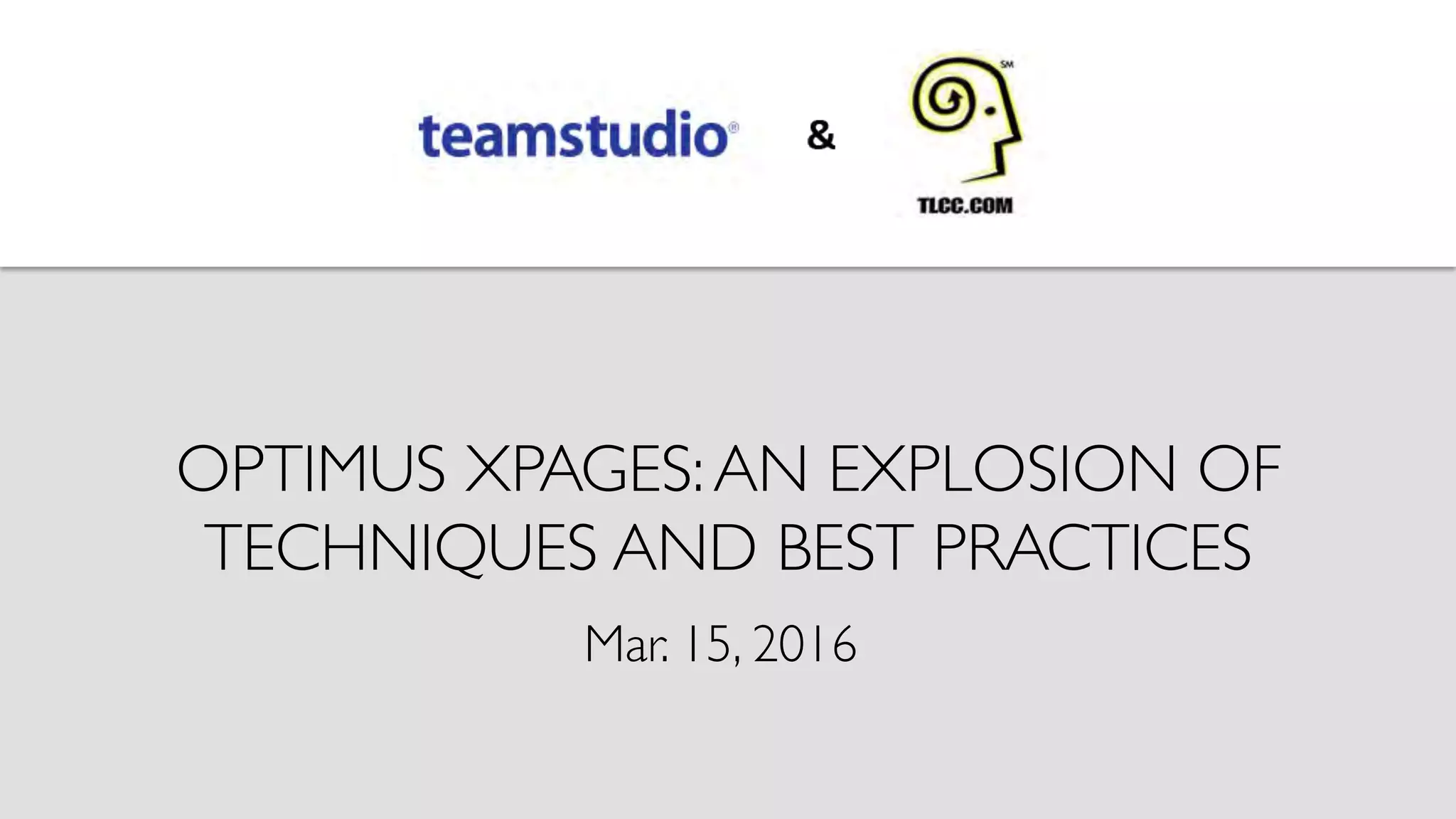 The document outlines a webinar discussing best practices and techniques for optimizing XPages development, hosted by experts from Teamstudio and TLCC. Key topics include application architecture, user experience, and optimization strategies using modern web technologies and frameworks. The session aims to equip developers with tools and insights to enhance application performance and adapt to cloud-based environments.