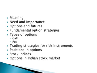 This document discusses options and their key concepts. It defines options as contracts that give the buyer the right, but not the obligation, to buy or sell an asset at a predetermined price. The main types are calls, which are options to buy, and puts, which are options to sell. Key terms discussed include premiums, strike prices, expiration dates, and intrinsic and time value. The uses of options for hedging and speculation are also summarized. Overall, the document provides a high-level overview of options, their characteristics and applications.