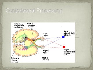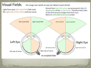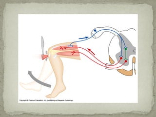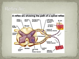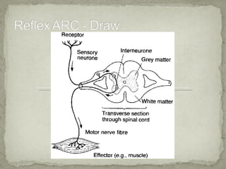 Stimuli can elicit reflexive or voluntary responses in organisms. A reflex is an involuntary, rapid response that involves at least three neurons: a sensory neuron that detects the stimulus, a relay neuron that passes the message to a motor neuron, which initiates the response in an effector like a muscle. Reflex arcs allow for quick, protective responses without conscious thought. Voluntary responses involve higher-level processing and are under conscious control.