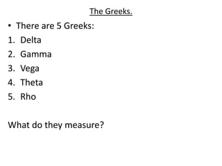 The document discusses the determinants of option price and the Greeks - Delta, Gamma, Vega, Theta, and Rho. It explains that these Greeks measure how sensitive an option's price is to changes in the underlying asset's price, volatility, time to expiration, and interest rates. Specifically, Delta measures change in option price for a $1 change in the underlying, Gamma measures rate of change of Delta, Vega measures change for a 1% volatility change, Theta measures daily time decay, and Rho measures change for a 1% interest rate change. Understanding how the Greeks change is important for risk management and making informed options trading decisions.
