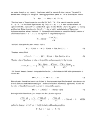 1) The document outlines drawbacks in the Black-Scholes option pricing theory, including mathematical errors in its derivations. Specifically, the assumption that a hedging portfolio eliminates risk is incorrect as a third term was omitted from the change in the portfolio value.