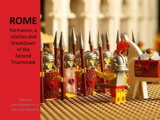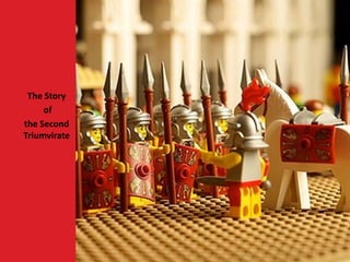The second triumvirate was formed in 43 BC by Octavian, Mark Antony, and Lepidus in order to consolidate power and defeat the republican forces of Brutus and Cassius. They engaged in brutal proscriptions that killed thousands, including Cicero. They defeated Brutus and Cassius at the battle of Philippi in 42 BC, effectively ending the republic. However, tensions grew between Octavian and Antony over the next several years as Antony allied with Cleopatra in Egypt, threatening Octavian's power and leading to war between the two rivals in 31 BC.