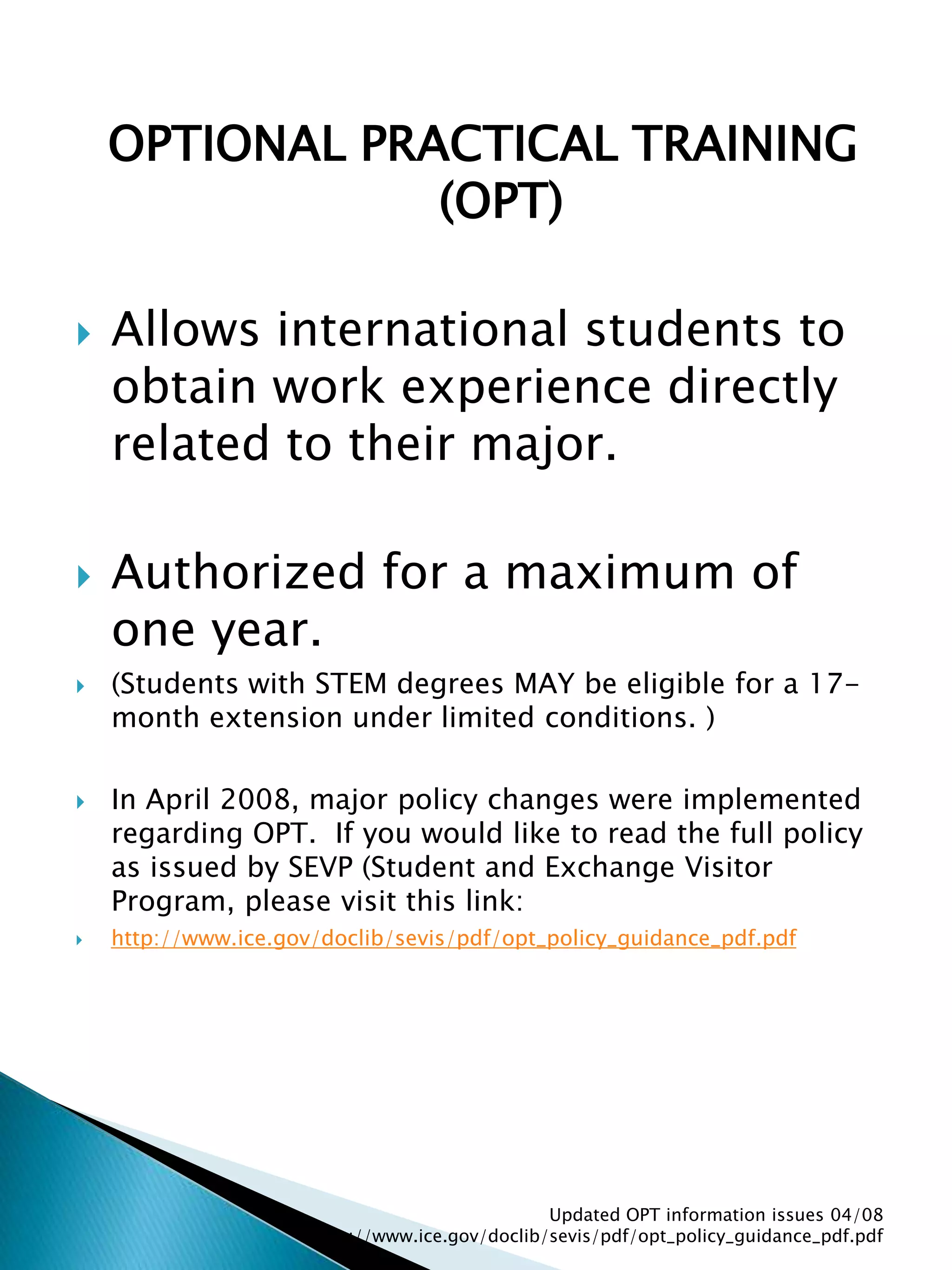 The document provides information about Optional Practical Training (OPT) for international students. It details that OPT allows students to gain work experience related to their major for up to one year after graduation. Students must apply either 90 days before or 60 days after graduation. Eligible students can work full-time for up to 12 months. The document outlines eligibility requirements, application procedures, reporting responsibilities, travel considerations, and extensions available for students in STEM fields.