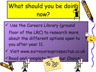 This document summarizes post-16 education and career options for students after year 11. It outlines various pathways including sixth form college, further education college, apprenticeships, and employment. Students are advised to research their options using the school's careers library and websites. They should speak to teachers, careers advisors, and attend college open days to inform their decision. The deadline to apply to most colleges is the end of November. Help is available for students who are undecided on their next steps.