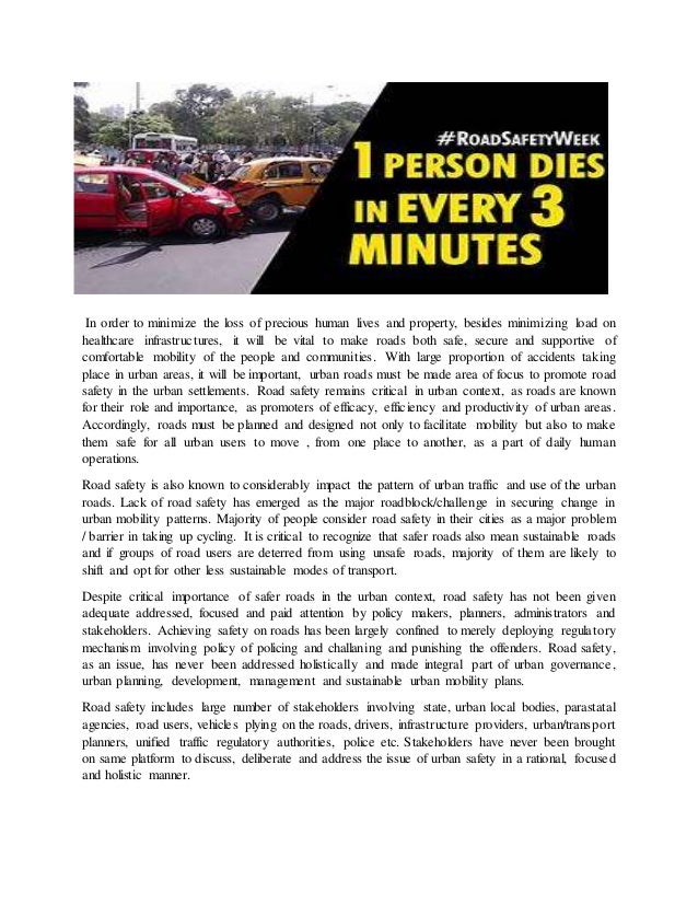 The document highlights the critical issue of urban road safety in India, emphasizing the alarming rates of road accidents and fatalities, particularly among vulnerable road users like pedestrians and cyclists. It discusses various challenges contributing to unsafe urban roads and proposes a holistic, community-driven approach to improve road safety through better planning, education, and stakeholder involvement. To achieve safer urban roads, the document suggests prioritizing pedestrian and cyclist safety, establishing stringent legal frameworks, and leveraging technology for monitoring and enforcement.