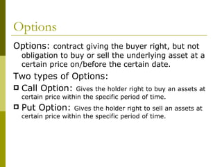 The document covers various options investment strategies, detailing the fundamental concepts of call and put options, as well as various trading strategies, including spreads, straddles, and protective puts. It explains how these strategies can be used based on the investor's expectations of stock price movements, outlining potential profits and risks associated with each. Additionally, it provides practical examples to illustrate the application of these strategies in real-world scenarios.