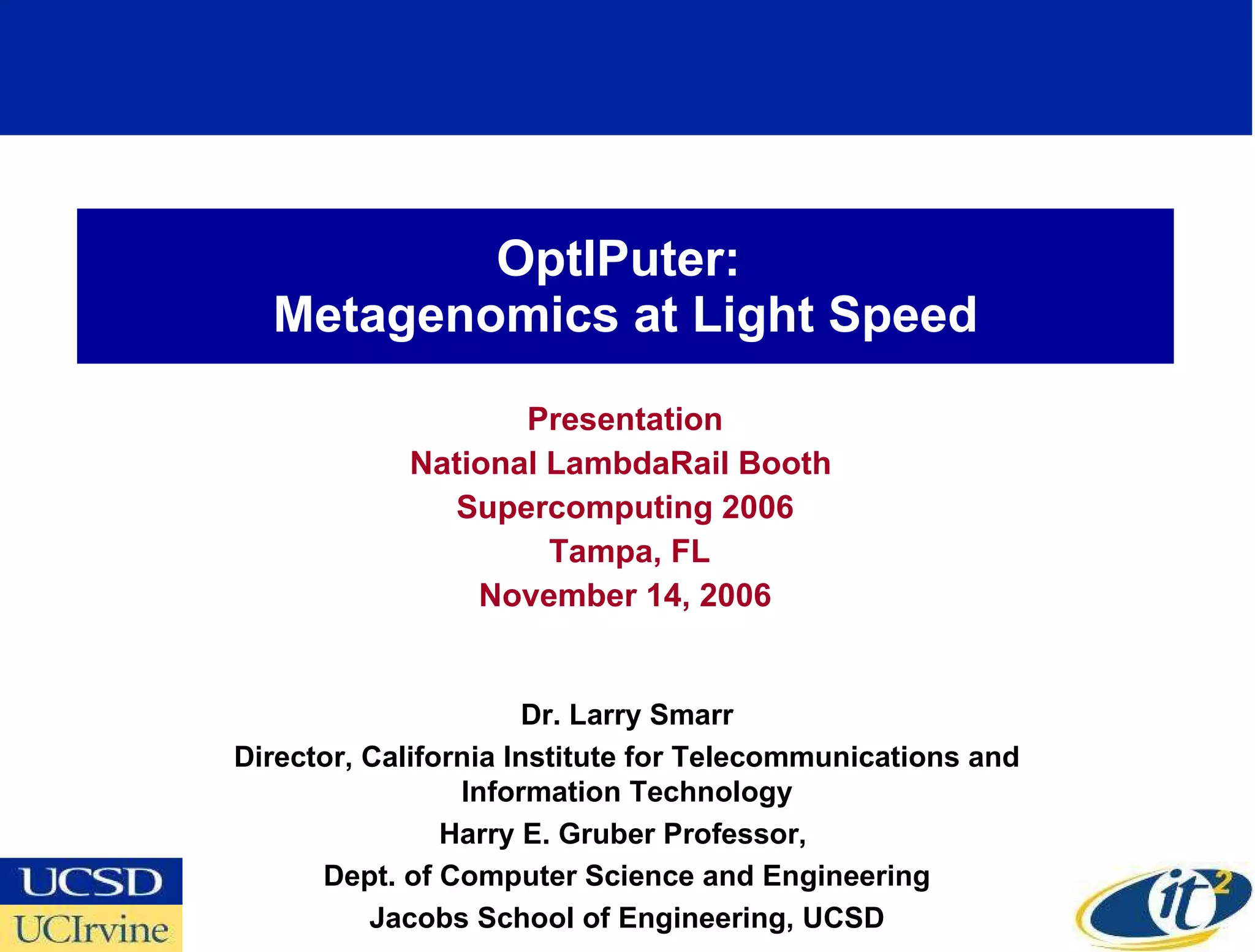The Optiputer project, led by Dr. Larry Smarr, aims to enhance metagenomics research through high-resolution data portals over dedicated optical channels, facilitating collaboration among global researchers. With a significant investment of $13.5 million over five years, the project has generated extensive genetic data, including over 1.2 million unknown genes from ocean microbes. The initiative integrates advanced computing infrastructure to enable interactive genome visualization and foster scientific discovery in microbial diversity and environmental genomics.