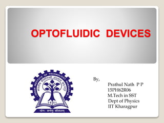 The document provides an overview of optofluidic devices, which integrate microfluidics and optical technology to manipulate fluids and light at the microscale. It highlights the unique properties of fluids for device design, applications in lab-on-a-chip systems, and mentions the advantages of integration and reconfigurability. The conclusion notes the rising interest in this field, despite a limited number of successfully commercialized devices.