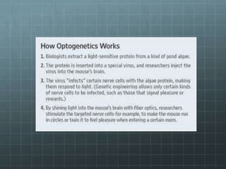 Optogenetics is a technique developed in 2006 that uses light to control neurons by inserting light-sensitive ion channel genes into brain cells. It works by using channelrhodopsin genes to excite neurons or halorhodopsin genes to inhibit neurons when light hits the nerve cell. This allows precise activation or stopping of specific neuron groups with high temporal resolution. Optogenetics offers potential treatment for conditions like anxiety, addiction, chronic pain, and sleep disorders by providing a less invasive way to stimulate or inhibit neurons compared to electrical methods. However, challenges include introducing foreign genes into the brain and technical issues like fiber optics posing infection risks or requiring heavy batteries.