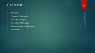 The document provides an overview of holography, defining it as a method for producing three-dimensional images using laser light and interference patterns. It outlines types of holograms, including reflection, transmission, and hybrid, and explains the working principles involved in recording and reconstructing holograms. Additionally, it discusses the technical aspects of interference patterns, recording mediums, and the process of creating visible images from holograms.