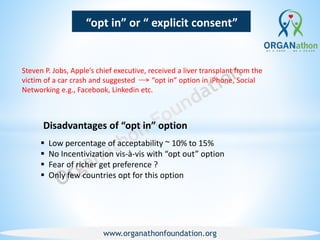 The document discusses three main options for organ donation systems: opt-in (explicit consent), opt-out (presumed consent), and mandated choice. Opt-in has the lowest donation rates around 10-15% due to lack of incentivization. Opt-out has the highest rates over 90% and is used by most countries by assuming consent unless individuals opt-out. Mandated choice requires individuals to make a choice at events like getting a driver's license, which can achieve high donation rates similar to opt-out. The document provides advantages and disadvantages of each system as well as addressing common myths around donation.