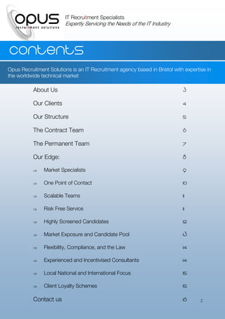 Opus Recruitment Solutions is an IT recruitment agency based in Bristol that specializes in both contract and permanent recruitment. They aim to expertly service the needs of their clients in the IT industry. They pride themselves on professionalism and have a dynamic team of experienced recruitment consultants. Their diverse client base ranges from large corporations to small IT businesses. They are passionate about developing long-term relationships with clients and delivering high quality candidates.