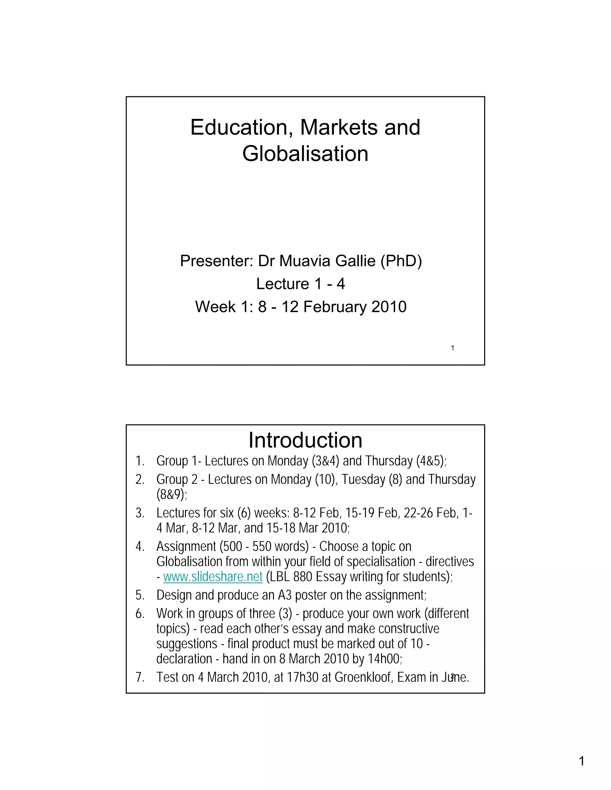 This document provides an overview of a lecture series on education, markets, and globalization. It outlines the schedule, assignment details, and topics to be covered in each of the 10 lectures. The lectures will analyze the impacts and key aspects of globalization, including the threats and opportunities it presents, the major players involved, and its effects on issues like women's rights and workers' rights. The document provides a detailed agenda and content for each lecture.