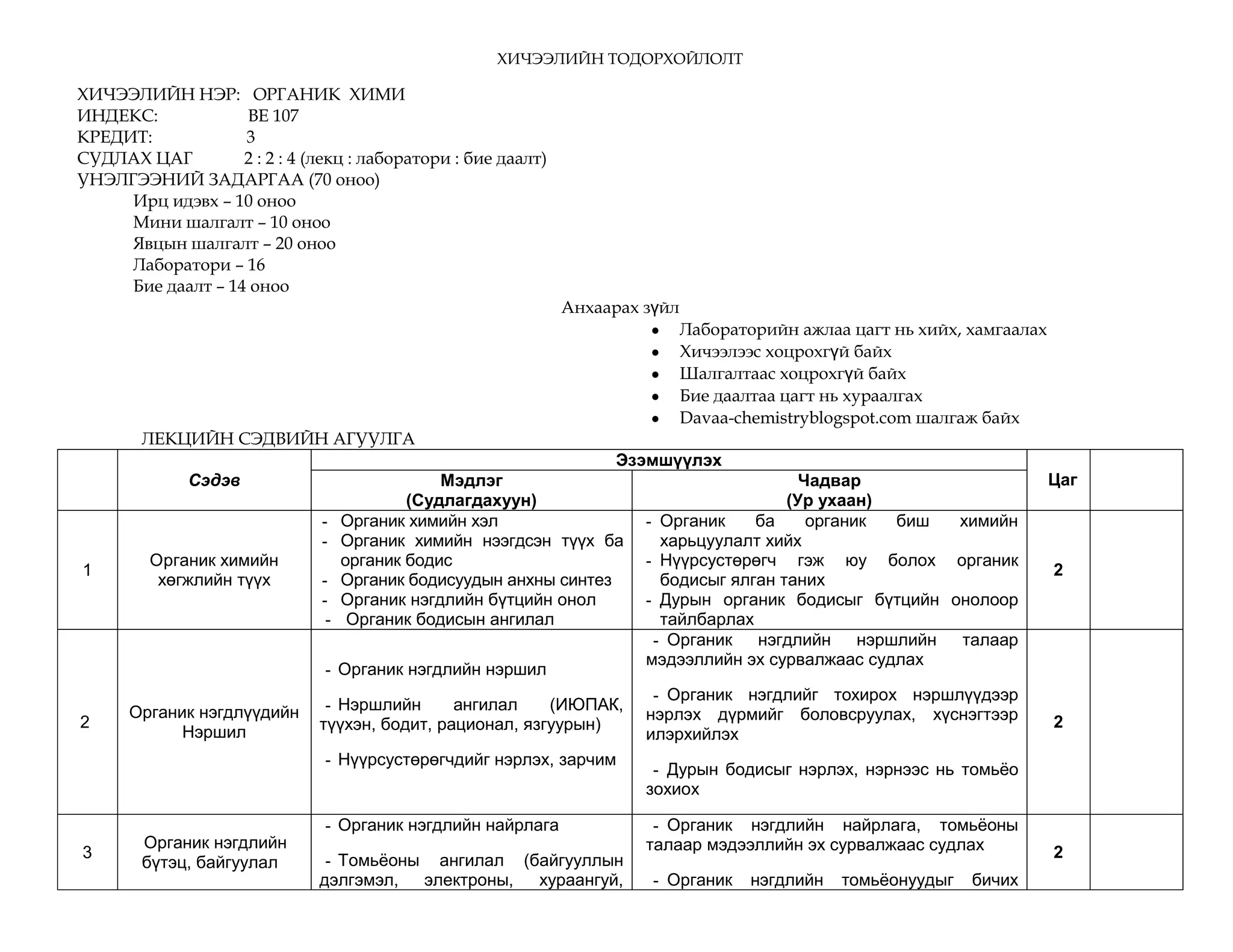 СУДЛАХ ЦАГ 2 : 2 : 4 (лекц : лаборатори : бие даалт)