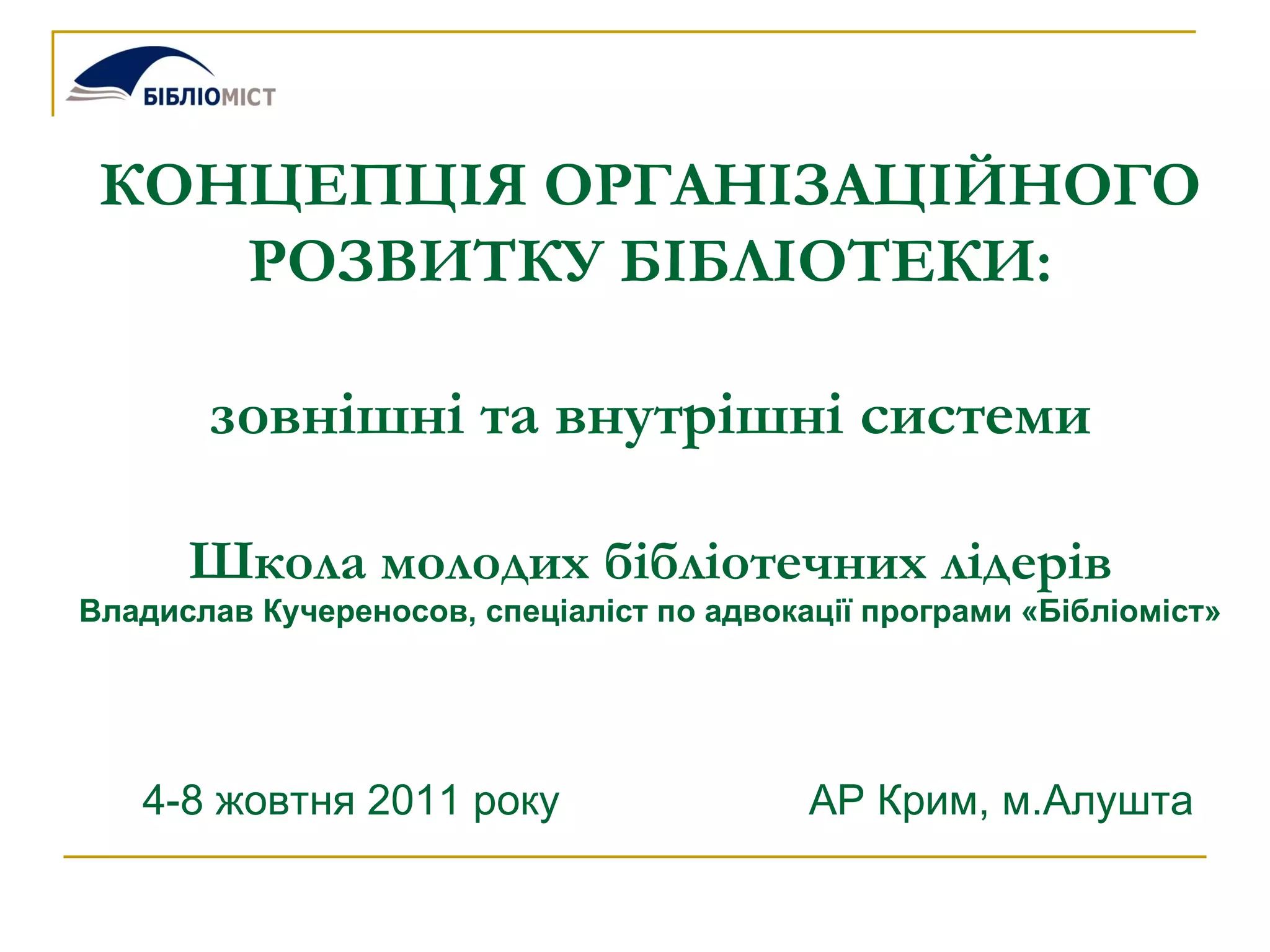 КОНЦЕПЦІЯ ОРГАНІЗАЦІЙНОГО РОЗВИТКУБІБЛІОТЕКИ: зовнішні та внутрішні системи Школа молодих бібліотечних лідерів Владислав Кучереносов, спец і аліст по адвокації програми «Бібліоміст» 4-8 жовтня 2011 року АР Крим, м.Алушта