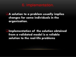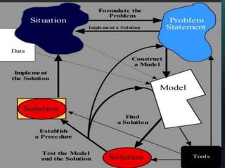 Operations research (OR) is an analytical method used to solve problems and make decisions by breaking problems down into basic components and solving them through defined mathematical steps. OR has many applications in fields like transportation, manufacturing, the military, and government for problems involving scheduling, facility location, health services, and more. It uses techniques like simulation, network analysis, and game theory to develop potential solutions, analyze alternatives, and test solutions in real-world situations.
