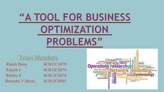 This document outlines a project to design and implement a tool for solving business optimization problems using operations research techniques. It lists the team members and provides an abstract, introduction, objectives, methodology, outcomes, literature review, and project plan. The tool will generate optimal solutions for problems involving resource allocation, production planning, transportation, and routing using linear programming, transportation models, assignment problems, and game theory.
