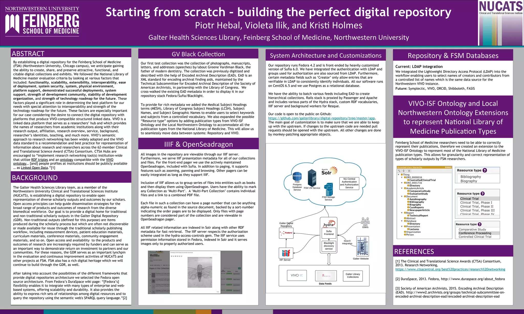 The Feinberg School of Medicine (FSM) at Northwestern University created a digital repository using the fedora open source architecture to represent diverse scholarly outputs while ensuring interoperability with existing platforms like vivo. The repository is designed to facilitate the sharing and preservation of both traditional and non-traditional scholarly materials, guided by open access principles to enhance accessibility and demonstrate research impact. Key features include integration with LDAP for user verification and enriched metadata through controlled vocabularies, aimed at maximizing the usability and discoverability of the stored materials.