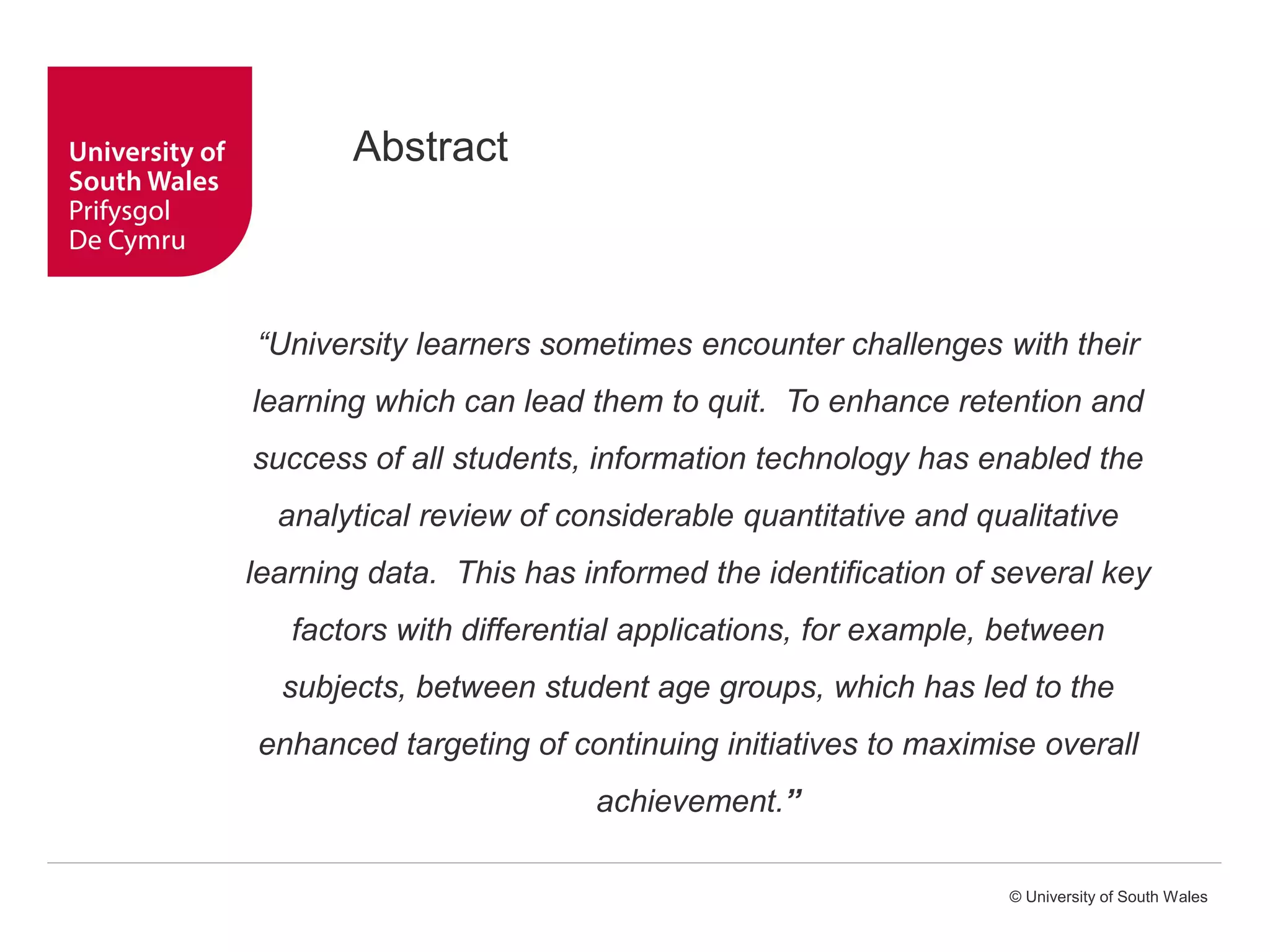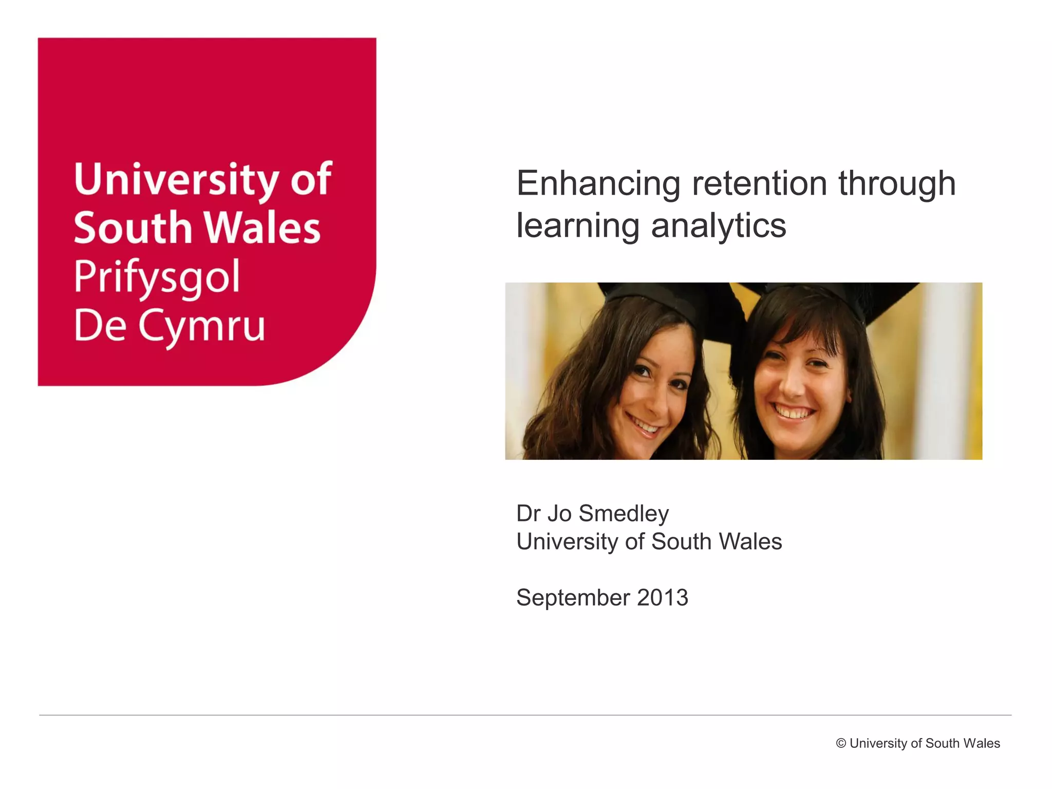 The document discusses how the University of South Wales employs learning analytics to improve student retention and success by analyzing both quantitative and qualitative data. It highlights the identification of key factors affecting student achievement, adaptation of data management practices, and collaborative initiatives to enhance educational outcomes. The focus is on using both internal activity monitoring and external survey data for predictive modeling and ongoing analysis in order to refine educational strategies.