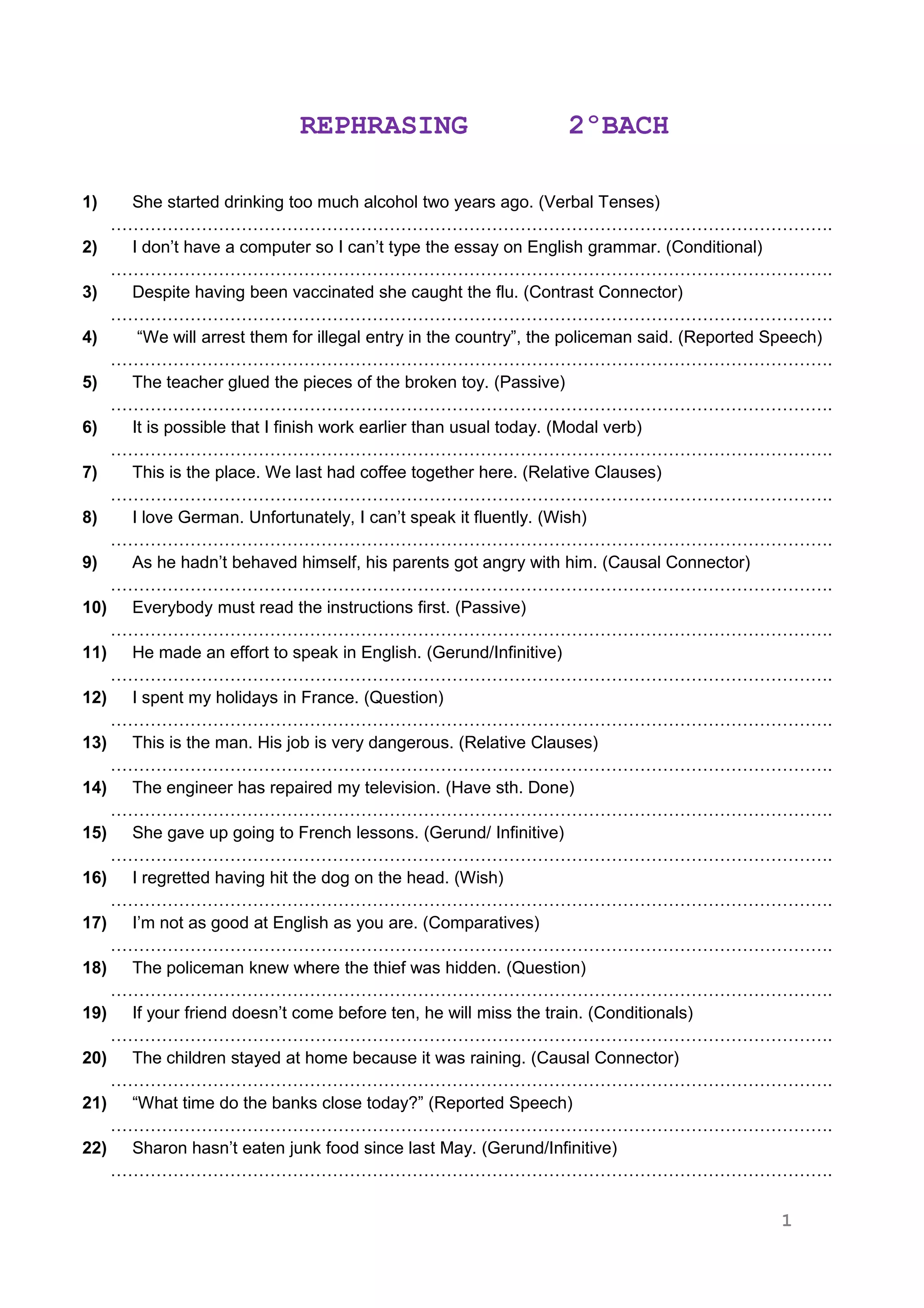 The document discusses various English grammar concepts including verb tenses, conditionals, contrast connectors, relative clauses, reported speech, passive voice, modal verbs, gerunds/infinitives, comparatives, causal connectors, questions, and wishes. It provides examples of sentences using these different grammar structures to illustrate their usage. The sentences cover topics like drinking alcohol, writing essays, catching illnesses, making arrests, repairing objects, finishing work, having coffee, speaking languages, parental anger, reading instructions, making efforts, holidays, jobs, drawings, regret, English ability, theft, trains, weather, banks, food, redecorating, relationships, drawings, games, parties, living locations, hospitals, skiing, free time