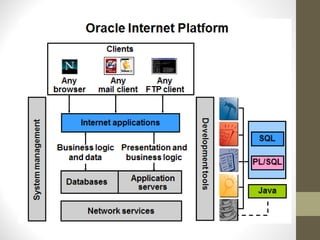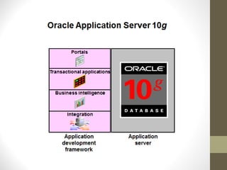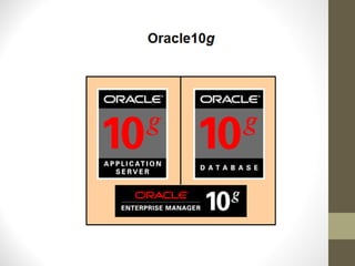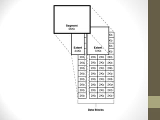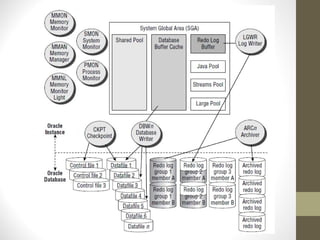 The document provides an overview of Oracle 10g database architecture including its physical and logical structures as well as processes. Physically, a database consists of datafiles, redo logs, and control files. Logically, it is divided into tablespaces containing schemas, segments, and other objects. The Oracle instance comprises the system global area (SGA) shared memory and background processes that manage tasks like writing redo logs and checkpointing data blocks. User processes connect to the database through sessions allocated in the program global area.