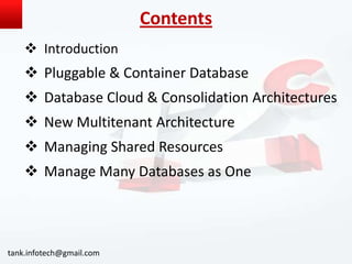 Oracle Database 12c introduces a new multitenant architecture that allows multiple pluggable databases to run within a single consolidated container database. This simplifies database consolidation, lowering costs by reducing the hardware, software, and staffing required for management and administration. Resources like CPU, memory and processes are managed at the container level, improving utilization rates. Databases can also be provisioned, backed up, patched, and upgraded more efficiently within this shared architecture.