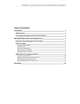 - Oracle Flex ASM is a new feature in Oracle Database 12c that changes the architecture of the ASM cluster. Previously, an ASM instance ran on every server in the cluster, but with Flex ASM only a smaller number (the ASM cardinality) need run on a subset of servers. If an ASM instance fails, a replacement will start on a different server to maintain the cardinality. Database instances can also reconnect to surviving ASM instances. Flex ASM provides capabilities needed for cloud computing and allows database clusters to rapidly adapt to changing workloads with minimal management.