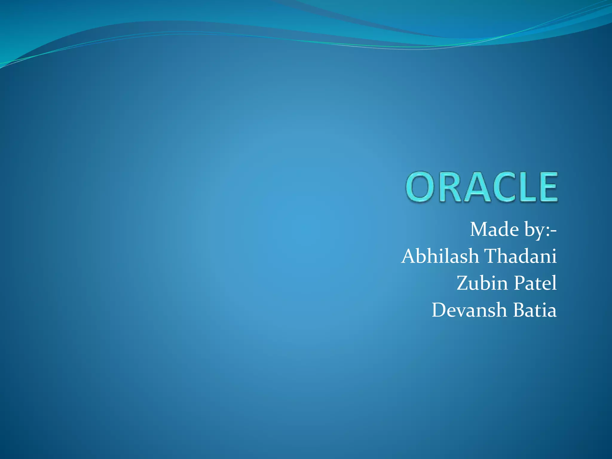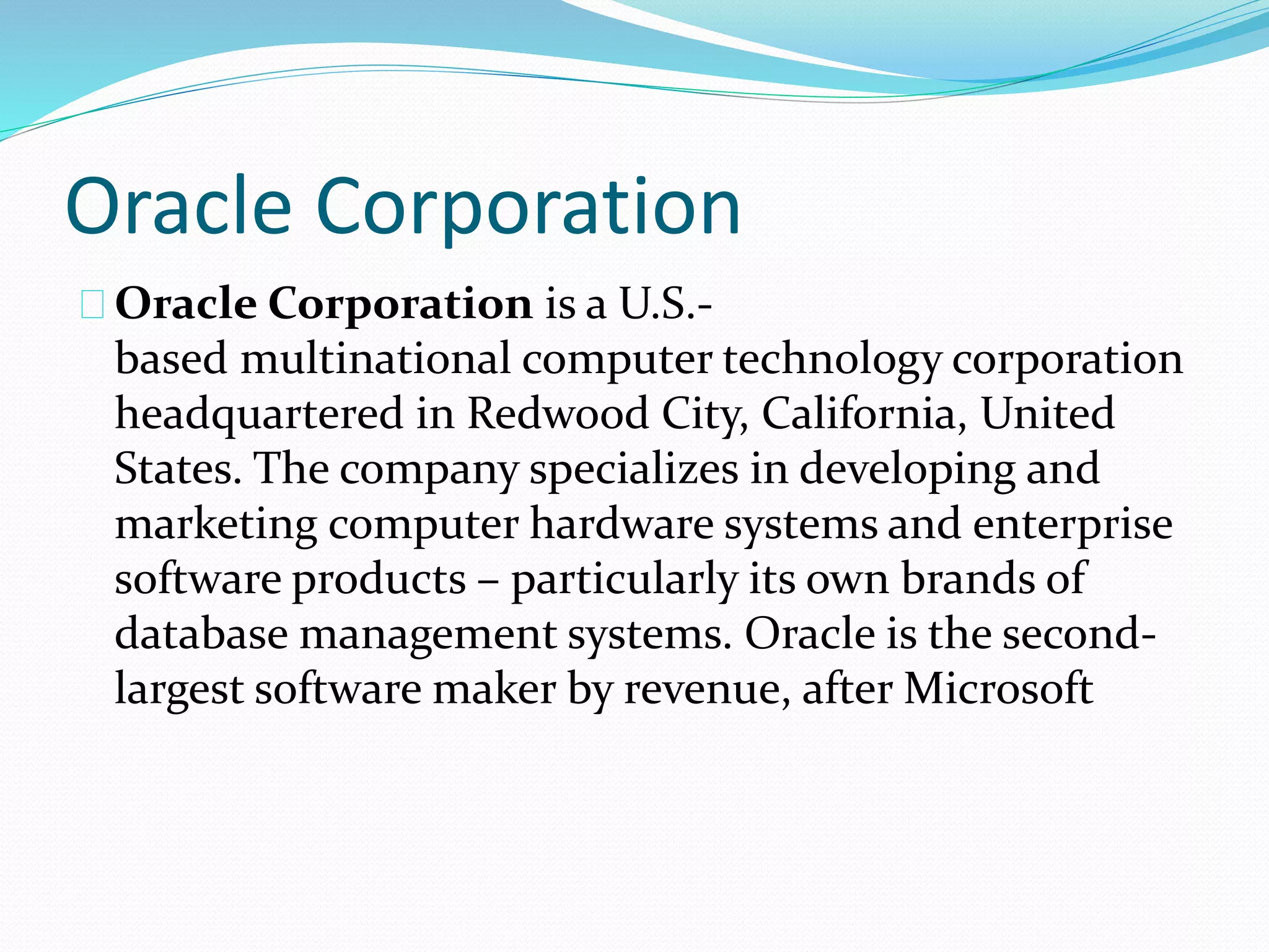 Oracle Corporation is a multinational computer technology corporation headquartered in Redwood City, California. It was founded in 1977 and specializes in developing and marketing database software and enterprise software. Larry Ellison is the current CEO. Oracle has grown significantly over the years through organic growth and acquisitions of companies to expand its software offerings.