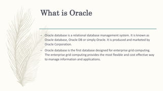 The document provides an overview of Oracle for beginners, including the different editions of Oracle database, data types in Oracle such as character, numeric, date, and LOB data types. It also discusses how to create and alter Oracle tables, including adding, modifying and dropping columns, as well as renaming tables and columns. Primary keys in Oracle tables are also covered at a high level.
