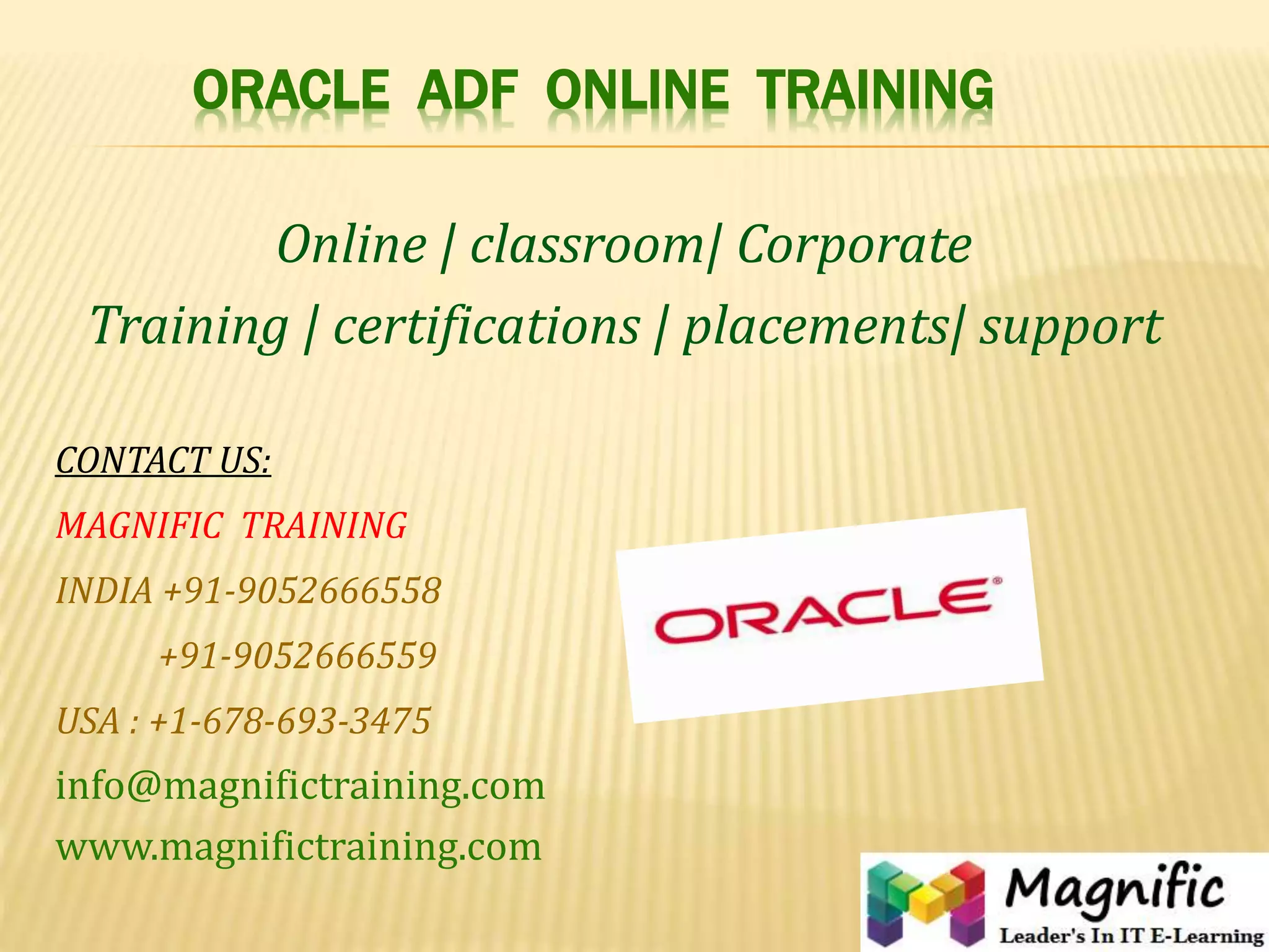 Magnific Training offers Oracle ADF online courses aimed at developers looking to build applications on Oracle 11g ADF. The training covers ADF fundamentals, web application development, as well as advanced concepts like data modeling, UI planning, and transactional capabilities. The courses are instructor-led and include hands-on learning opportunities, catering to various professionals including Oracle forms developers and ERP consultants.