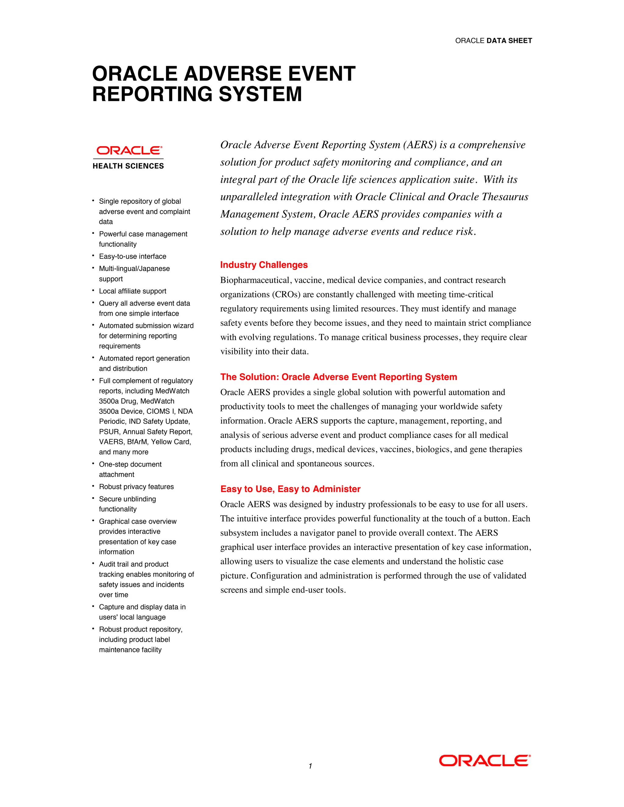 reports, including MedWatch Oracle AERS provides a single global solution with powerful automation and