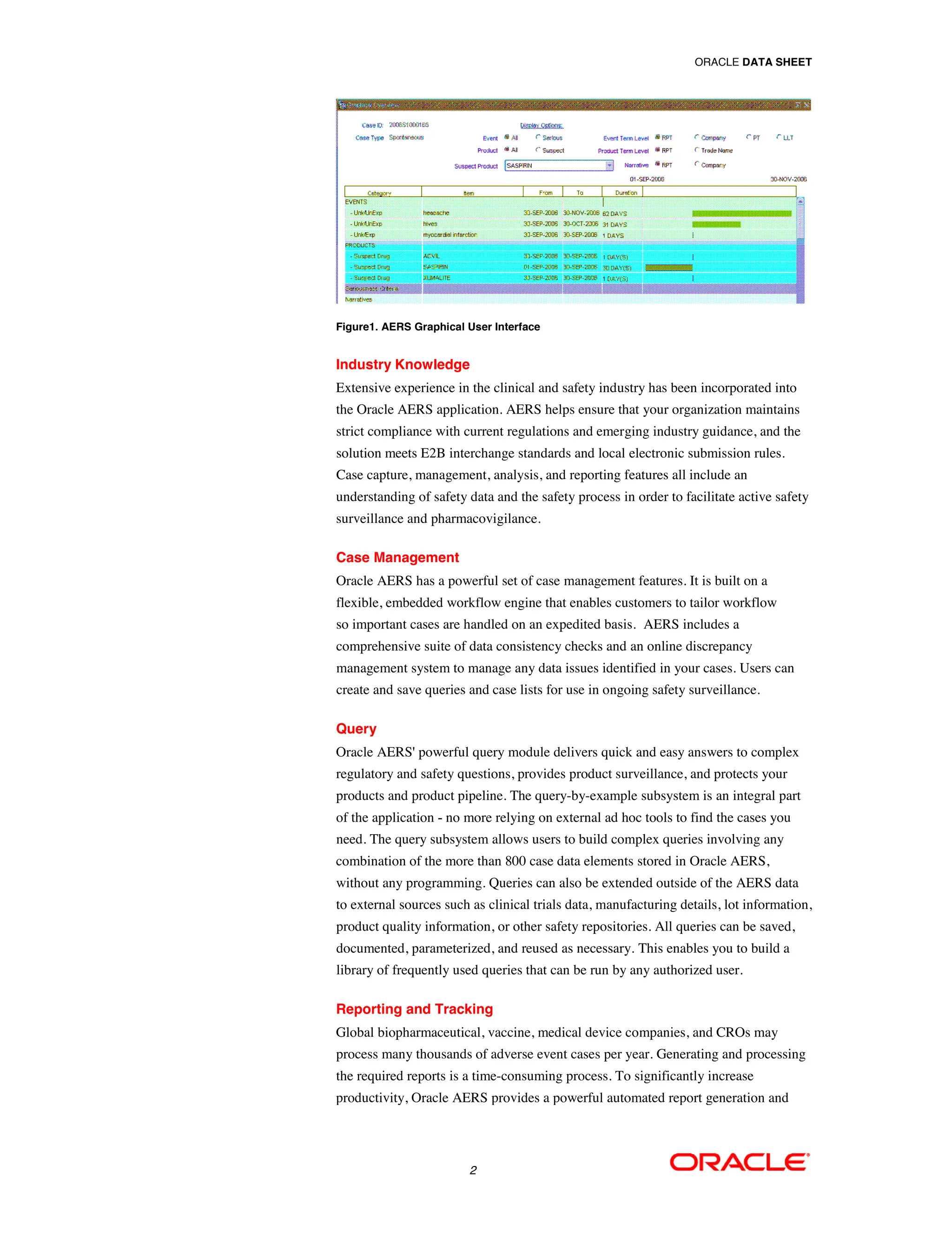safety profile. Oracle AERS offers a robust repository that stores and tracks the
