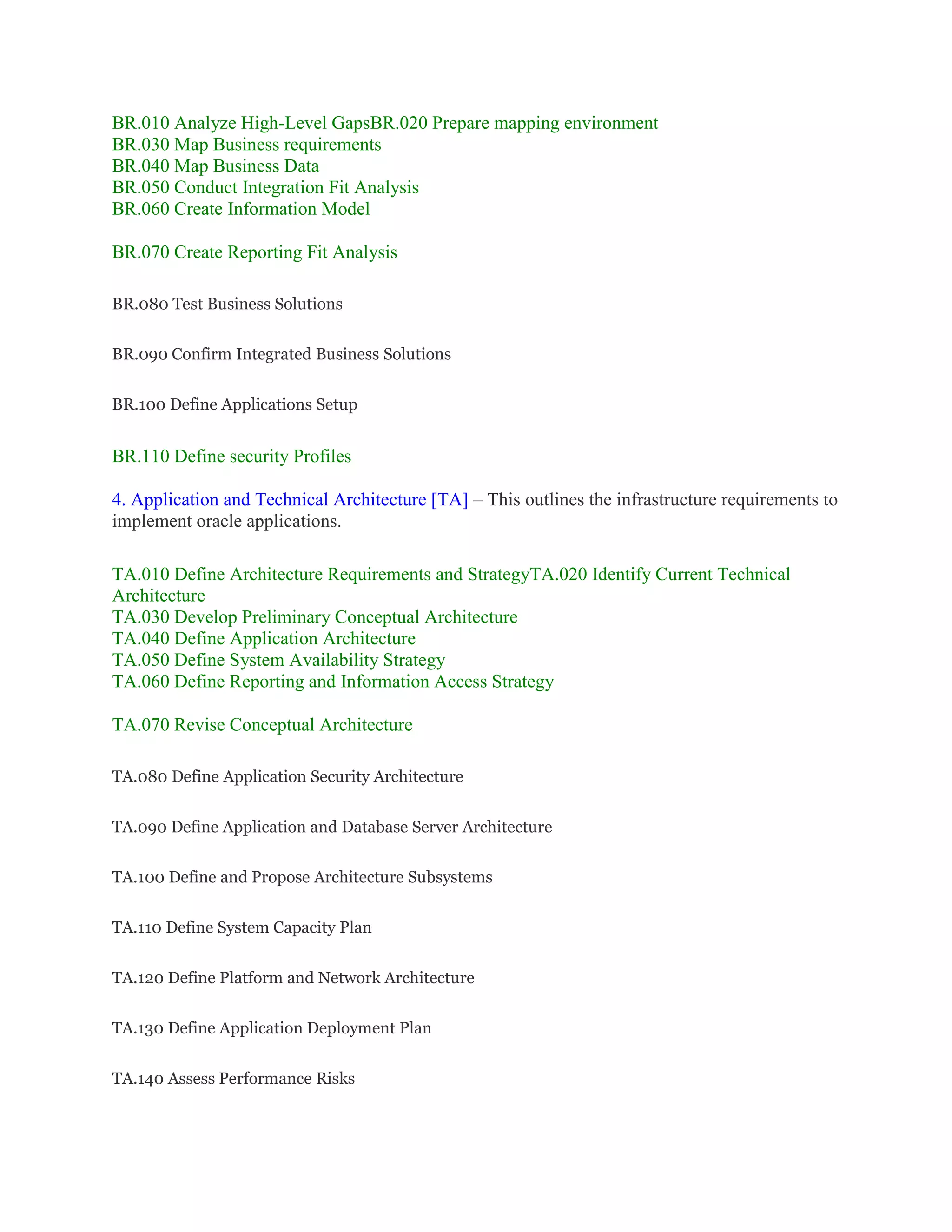 The document describes the Oracle Application Implementation Methodology (AIM) which provides a project management framework for implementing Oracle applications. The AIM methodology consists of 11 processes covering the full project lifecycle from initial planning and requirements gathering to production deployment. Each process contains multiple phases to guide tasks such as business analysis, system configuration, testing, user adoption and migration to the new system.