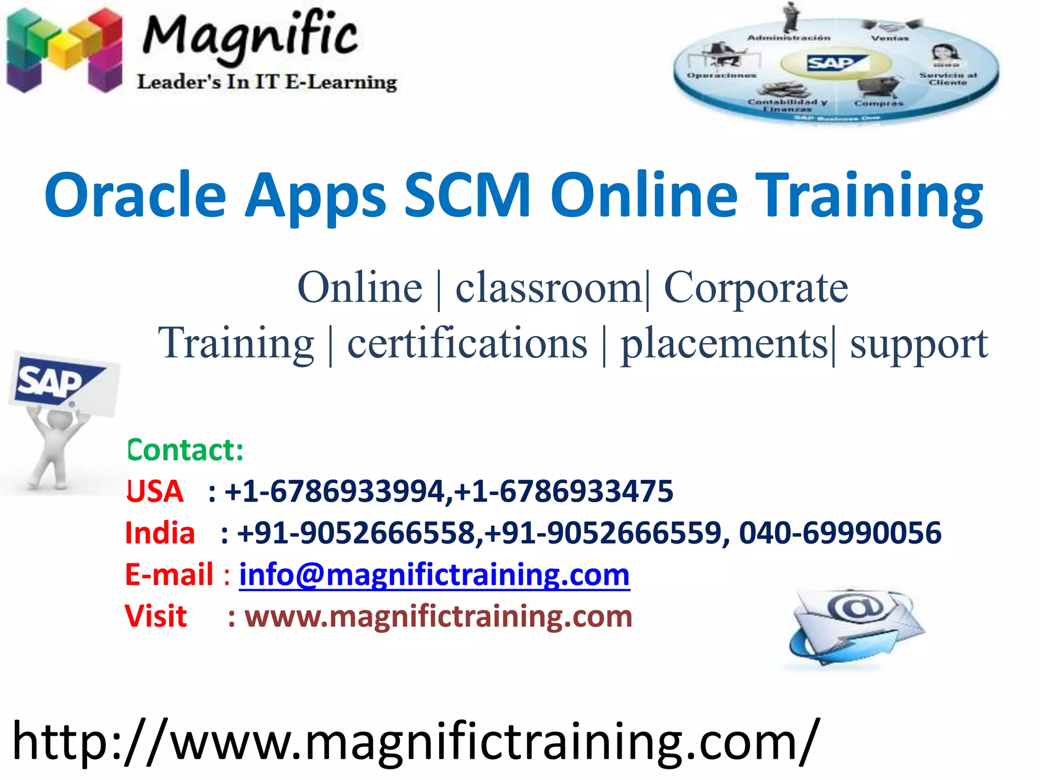 The document provides information about Oracle Apps SCM online training including details on ERP (Enterprise Resource Planning), specifically SAP and its various modules, releases, and installation processes. It also describes the architecture, work processes involved in SAP systems, and the support services offered post-training. Additionally, it contains contact information for enrolling in training sessions and accessing support.