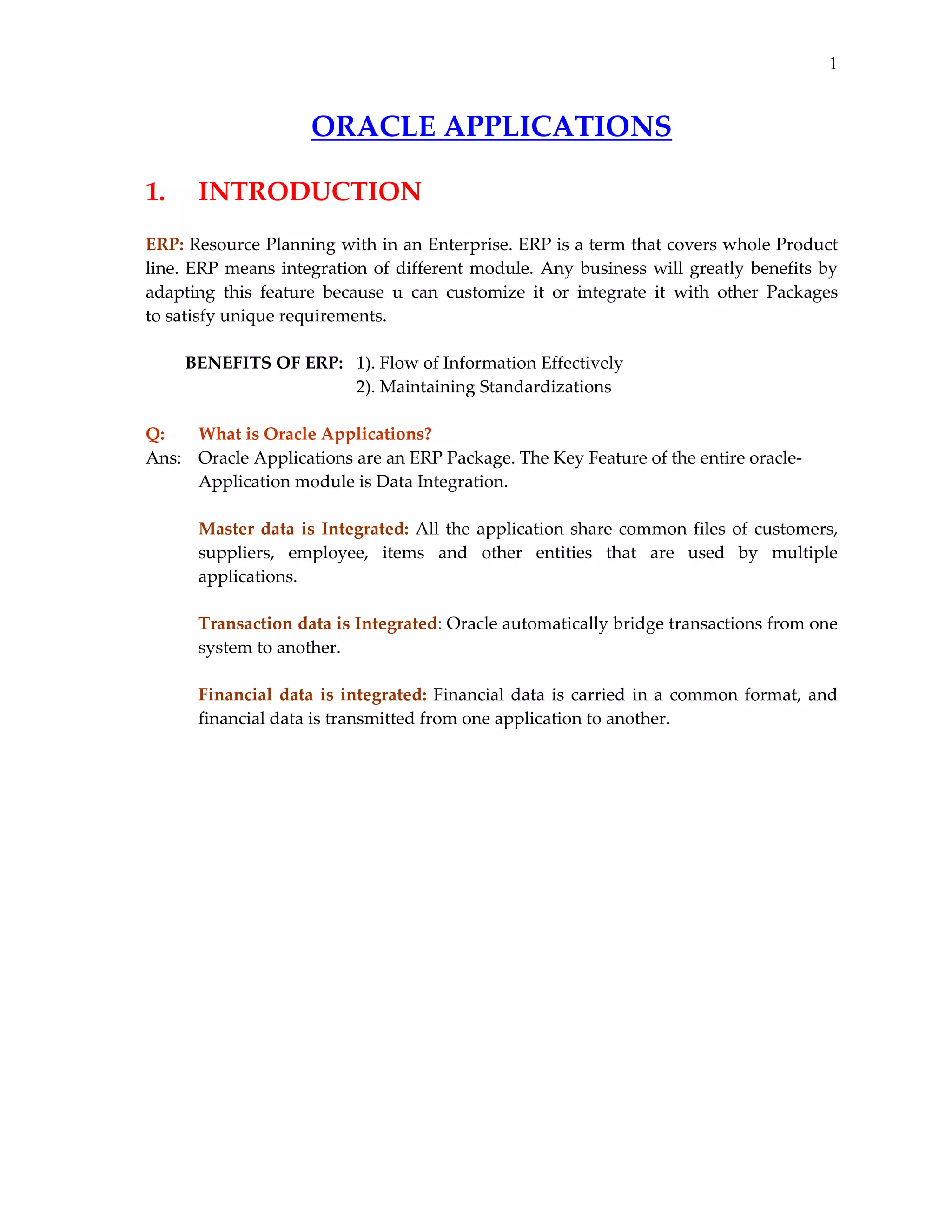 Oracle Applications is an enterprise resource planning software package developed by Oracle Corporation. It includes various modules for functions like finance, manufacturing, supply chain management, and human resources. The key features of Oracle Applications include integrated master data, transaction data, and financial data across modules. A new module can be developed for Oracle Applications by registering the module, creating a schema for it, setting up the necessary directory structure, and building forms for the module using the Form Builder tool while following Oracle's coding standards.
