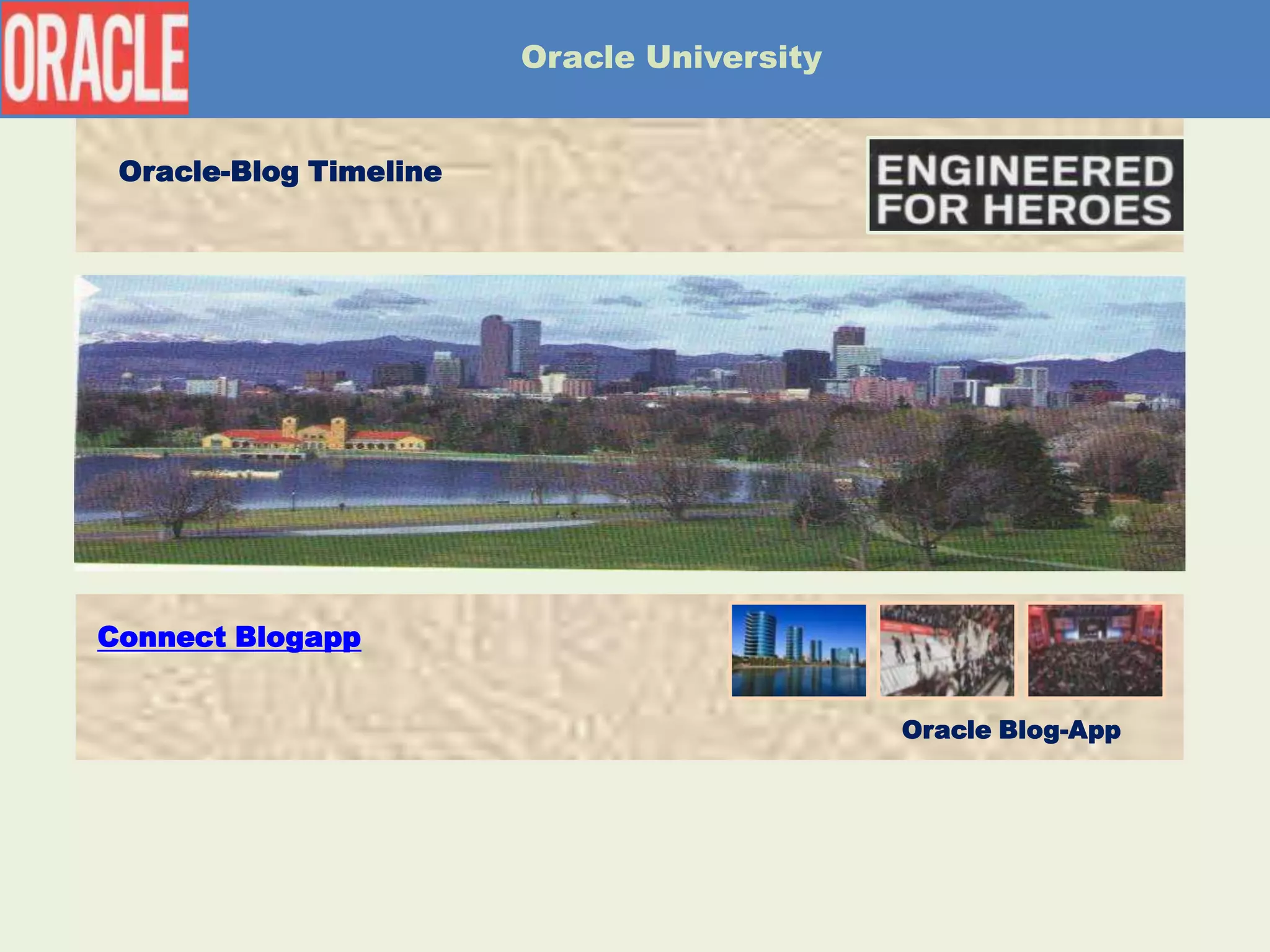 The document describes an Oracle blog timeline app that allows users to download the app, view a table of contents with multiple blog post pages, and navigate between the app, timeline, blog posts and download page. It lists the app name, timeline, blog posts, and a button to go to the main content pages or download the app.