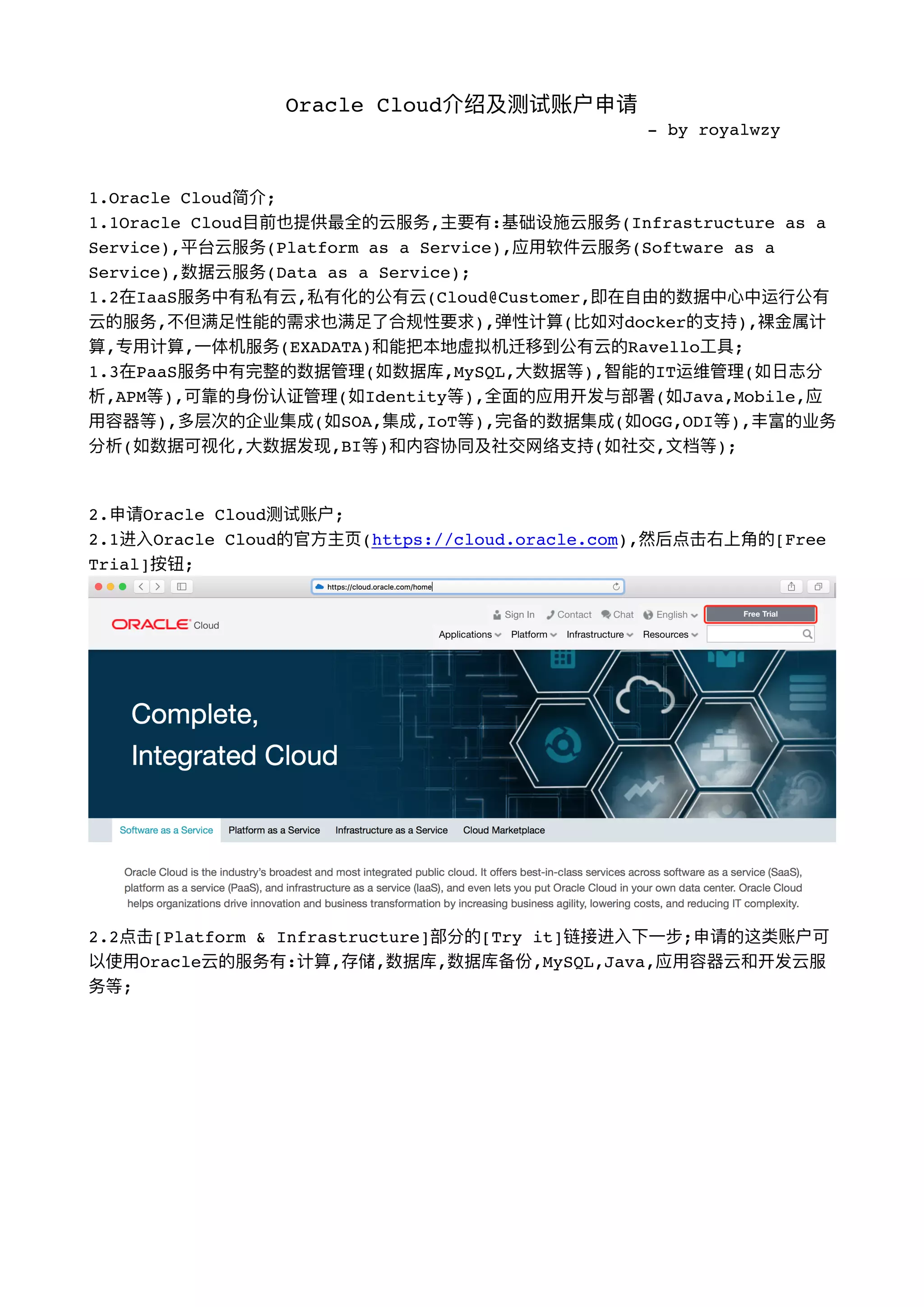 2.1进⼊入Oracle Cloud的官⽅方主⻚页(https://cloud.oracle.com),然后点击右上⻆角的[Free