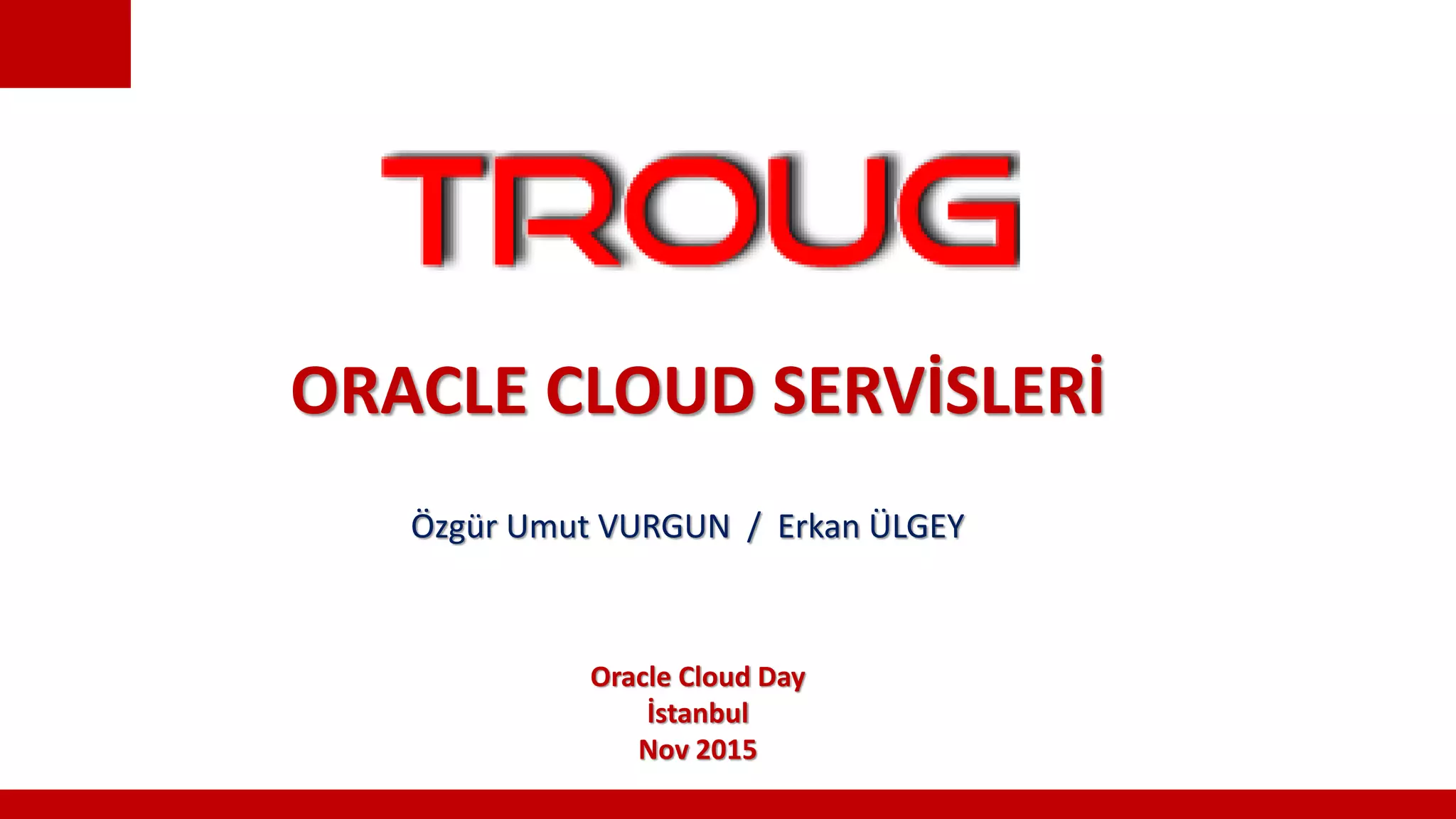 The document summarizes Oracle Cloud services including Platform as a Service (PaaS), Infrastructure as a Service (IaaS), and Software as a Service (SaaS). It provides an overview of Oracle database, middleware, and engineered systems available on Oracle Cloud. It also discusses how to create a database on Oracle Cloud using REST APIs and cURL, and how to perform RMAN backups to Oracle Cloud Storage. Finally, it covers connecting to databases on Oracle Cloud using Enterprise Manager and SQL Developer.