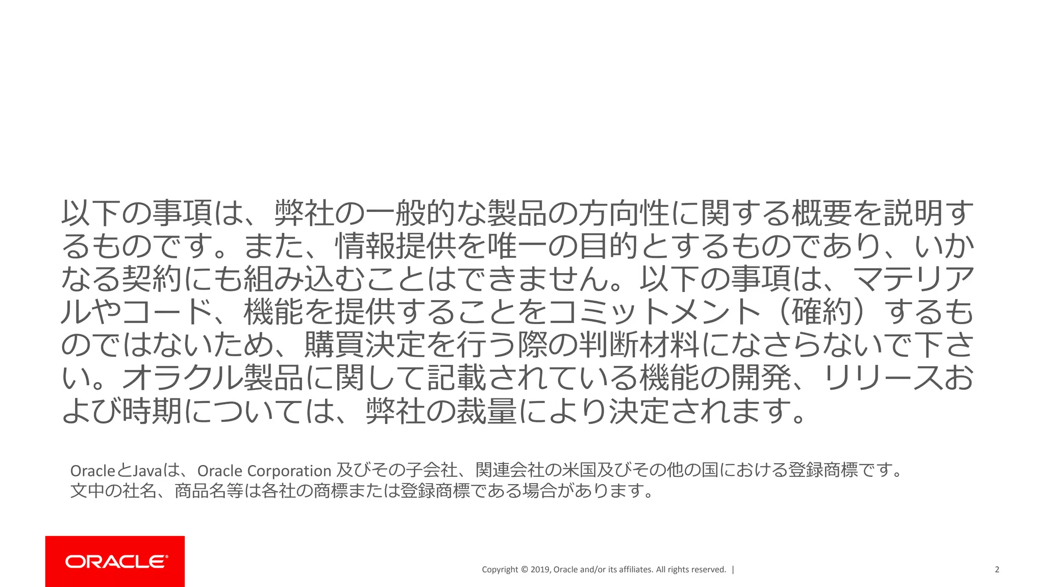Oracle and/or its affiliates. All rights reserved. | OracleとJavaは、Oracle Corporation 及びその子会社、関連会社の米国及びその他の国における登録商標です。 文中の社名、商品名等は各社の商標または登録商標である場合があります。 以下の事項は、弊社の一般的な製品の方向性に関する概要を説明す るものです。また、情報提供を唯一の目的とするものであり、いか なる契約にも組み込むことはできません。以下の事項は、マテリア ルやコード、機能を提供することをコミットメント(確約)するも のではないため、購買決定を行う際の判断材料になさらないで下さ い。オラクル製品に関して記載されている機能の開発、リリースお よび時期については、弊社の裁量により決定されます。 2